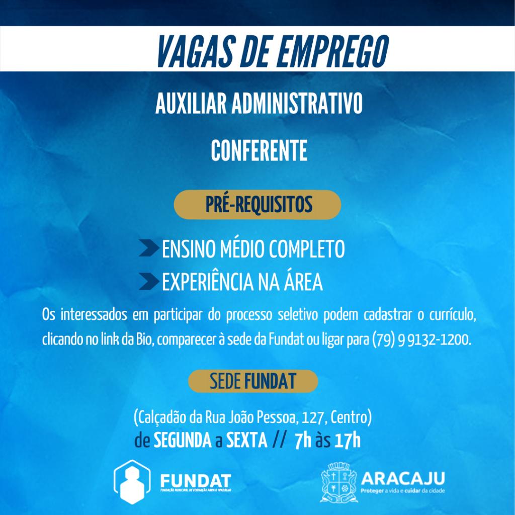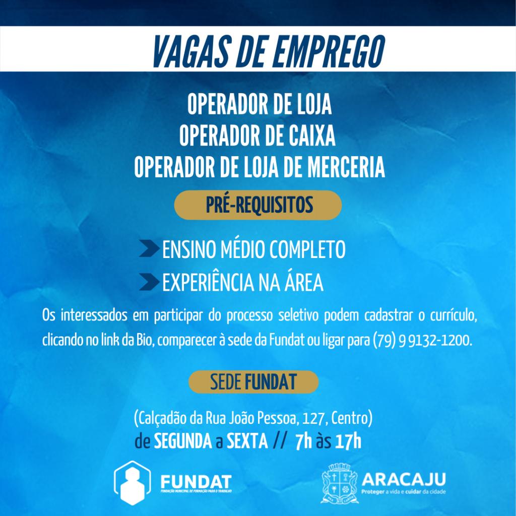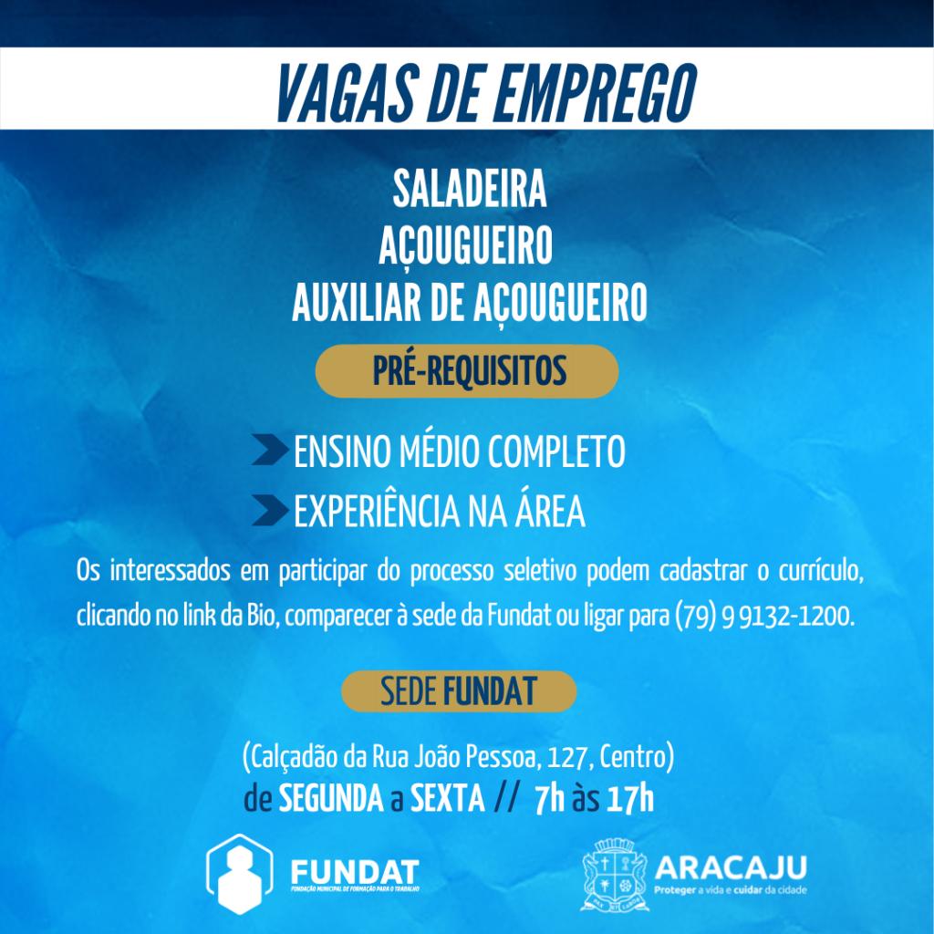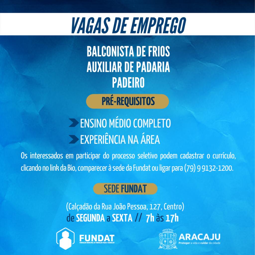 Nesta segunda-feira, 28, a Prefeitura de Aracaju, por intermédio da Fundação Municipal de Formação para o Trabalho (Fundat), anuncia a oferta de de 50 vagas de emprego para a população aracajuana.