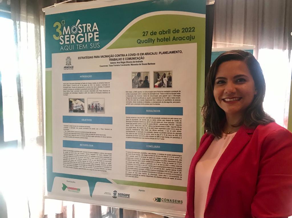 O segundo lugar foi da assessora técnica da diretoria de Vigilância e Atenção à Saúde de Aracaju, Ana Régia Oliveira, com o projeto intitulado 'Estratégias para vacinação contra a covid-19 em Aracaju: planejamento, trabalho e comunicação',