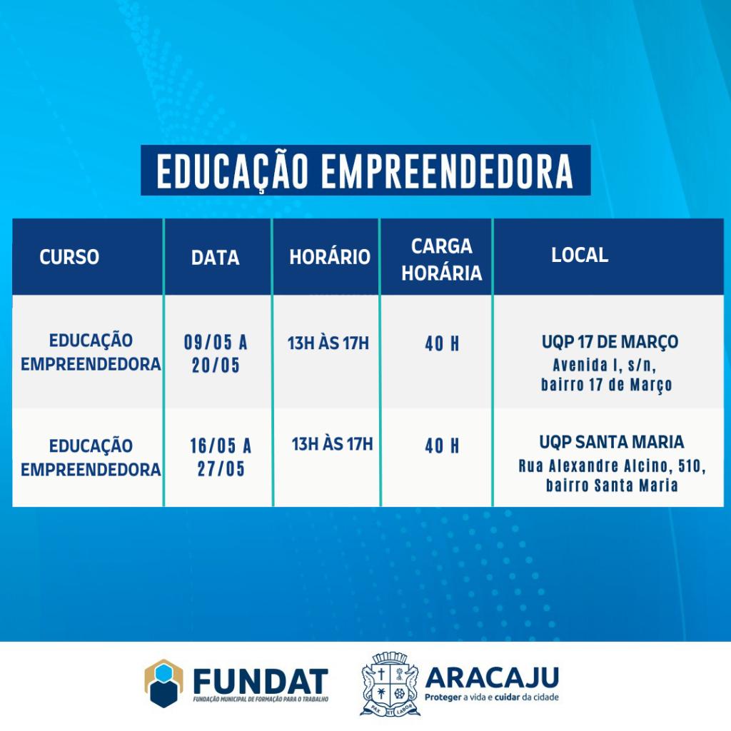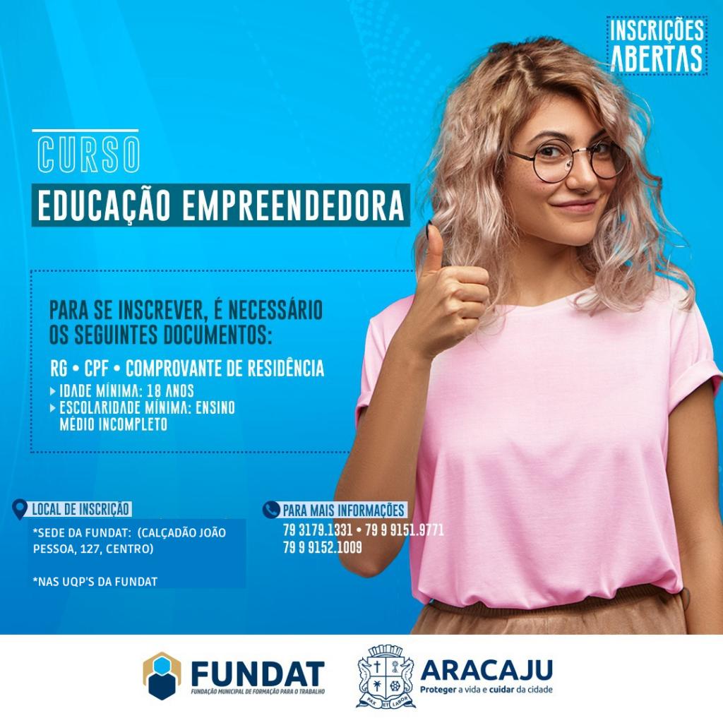 A Prefeitura de Aracaju abre, a partir desta terça-feira, 3, as inscrições para duas novas turmas do curso Educação Empreendedora: nstrumento de transformação (40h), capacitação ofertada pela Fundação Municipal de Formação para o Trabalho (Fundat).