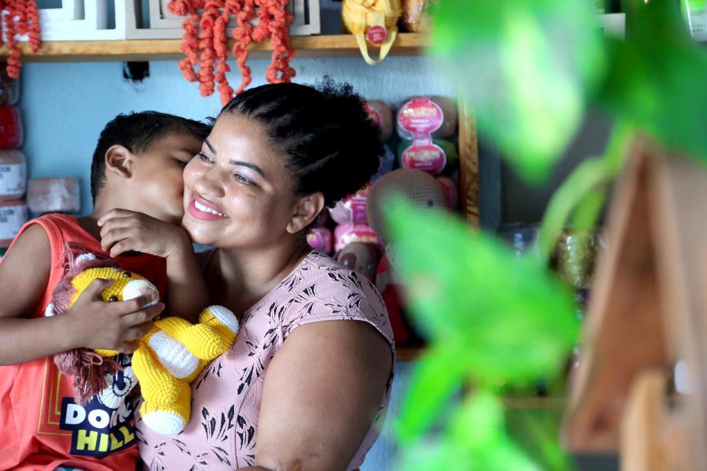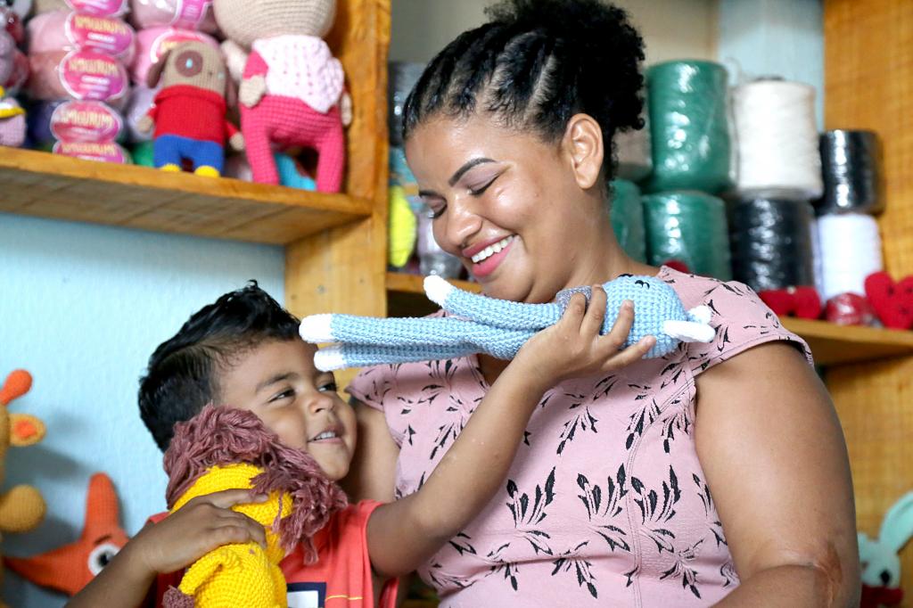 “Tentei encontrar uma maneira de, no futuro, quando ele [o filho] estivesse mais crescidinho, eu pudesse mostrar que, apesar de não o ter gestado, ele também foi esperado por mim, com muita expectativa. Então, procurei os cursos de artesanato da Fundat para poder decorar o quarto dele com minhas próprias mãos. Fiz cursos para aprender a fazer objetos em MDF, pintura em tela e, depois, crochê, mais especificamente o amigurumi [técnica de tricô e crochê] que, hoje, é a minha fonte de renda”, conta Shirley.