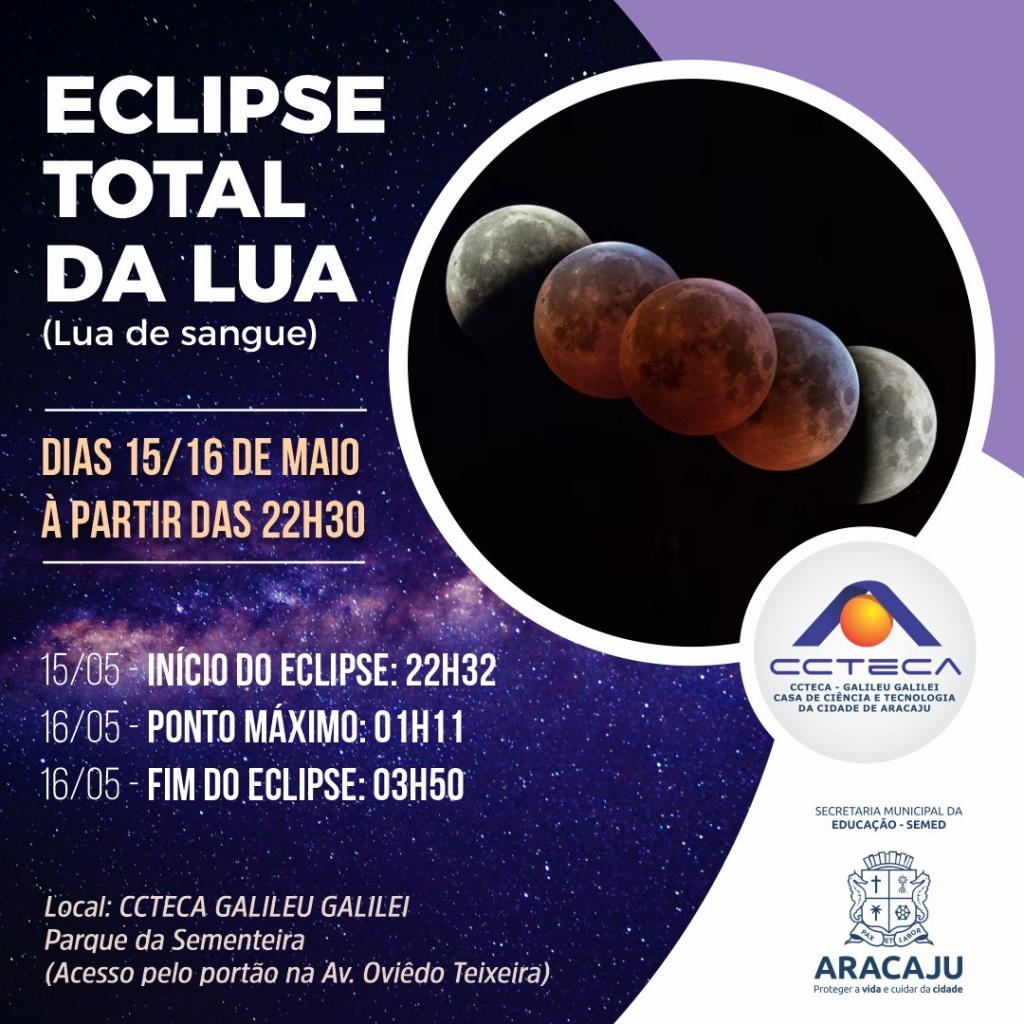 Na noite do próximo domingo, 15, um eclipse total da lua poderá ser observado do Brasil. A Casa de Ciência e Tecnologia da Cidade de Aracaju Galileu Galilei (CCTECA), administrada pela Secretaria Municipal da Educação (Semed), promoverá a observação com telescópios do fenômeno, também chamado de Lua de Sangue, na área externa do local, que fica dentro do Parque Augusto Franco. A observação iniciará a partir das 22h30.