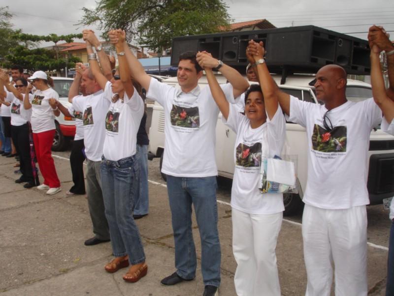 Preservar a natureza como defesa à vida é uma visão ampliada de saúde que a equipe da Unidade de Saúde da Família (USF) Manoel de Souza Pereira, localizada no conjunto Sol Nascente, vem desenvolvendo nesses últimos quatro anos com a já tradicional Caminhada da Jabotiana. O evento aconteceu na manhã de hoje, 25, e contou com a presença do secretário Municipal de Saúde, Rogério Carvalho, além de lideranças locais, usuários, moradores e estudantes de todas as escolas situadas no bairro. A Caminhada teve início às 8 horas com saída da praça do conjunto Santa Lúcia e destino à praça do conjunto Sol Nascente. Antes da saída, os instrutores da Academia da Cidade fizeram um breve aquecimento físico com os participantes. Alunos das escolas da comunidade levaram às ruas os cartazes e trabalhos realizados durante a semana que antecedeu o dia da mobilização, que traziam entre outros temas: a preservação dos manguezais, o esperdício da água, cuidados com o lixo e materiais recicláveis. De acordo com a gerente da unidade, Karine Garrido, o projeto foi pensado para trabalhar com toda a comunidade do bairro Jabotiana, mostrando para ela como a preservação do meio ambiente interfere na saúde dos moradores. “Na elaboração do projeto, levamos em conta um levantamento realizado através do reconhecimento da área e cadastramento das famílias, onde identificamos diversas situações de risco ambiental diretamente relacionadas aos problemas de saúde detectados no bairro”, explicou. Segundo ela, doenças como dengue, leishimaniose cutânea, esquistossomose, e insuficiência respiratória aguda eram muito comuns entre a população local. Karine Garrido explica ainda que com o desenvolvimento do projeto, pouco a pouco a realidade ambiental da Jabotiana começou a mudar. Através do trabalho de conscientização e mobilização, junto às escolas, ao Conselho Local de Saúde e à Associação de Moradores, algumas situações presenciadas anteriormente já não fazem mais parte do cenário local. O resultado foi a melhoria da saúde da população e a valorização dos espaços públicos. Segundo ela, a Empresa Municipal de Serviços Urbanos (Emsurb) também teve um papel importante na redução dos índices, através da implantação da coleta seletiva de lixo no bairro. O evento foi encerrado com um grande círculo em volta da praça, simbolizando um ato de reflexão e união entre todos os que participaram. “Hoje é um dia para refletirmos o valor da vida, de consolidarmos ações que garantam a sua defesa e a luta contra aqueles que em seus atos destroem a natureza e todas as formas de vida”, ressalta o secretário Municipal de Saúde, Rogério Carvalho.