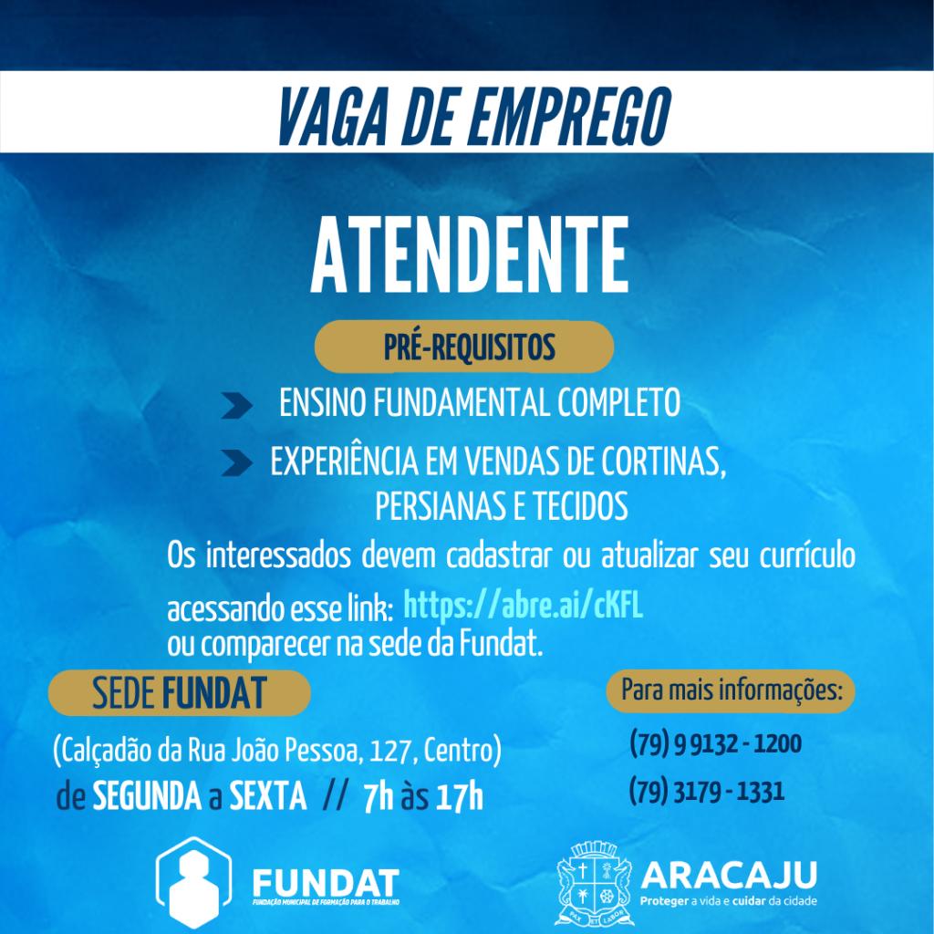 Os interessados em participar dos processos seletivos referentes às vagas disponíveis podem se candidatar de três formas: cadastrando o currículo através do link https://abre.ai/egNV que também encontra-se a partir da bio do perfil da Fundat no Instagram - @fundataracaju , comparecendo à sede da Fundat, no calçadão da rua João Pessoa, 127, Centro, portando RG, CPF e currículo; ou ainda ligando para (79) 9 9132-1200.
