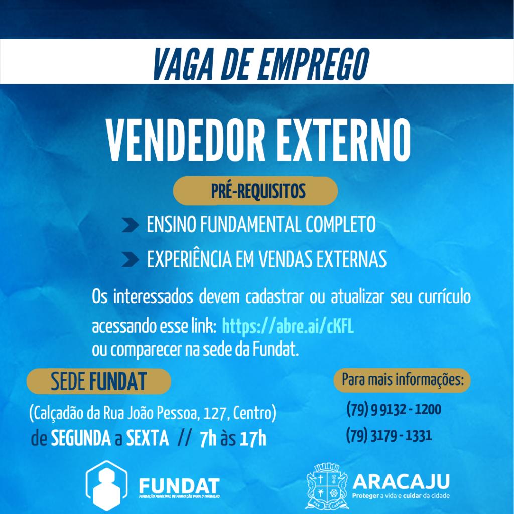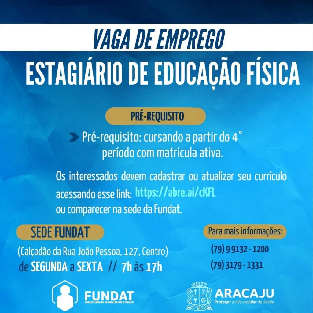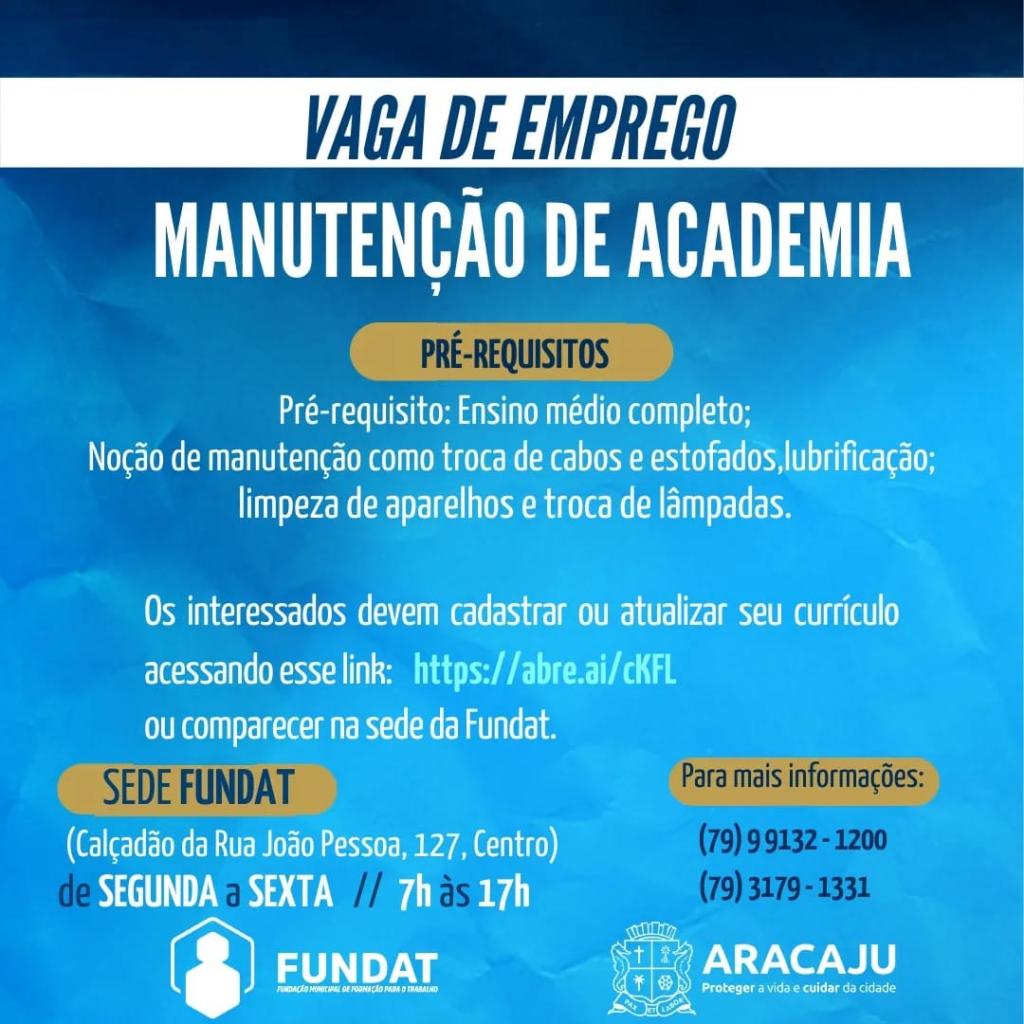 A Prefeitura de Aracaju, por intermédio da Fundação Municipal de Formação para o Trabalho (Fundat), anuncia nesta segunda, 6, a oferta de 11 oportunidades de emprego para os cidadãos. As vagas são destinadas à ampla concorrência e voltadas às funções de manutenção de academia, estágio em Educação Física, vendedor externo, frentista e atendente.