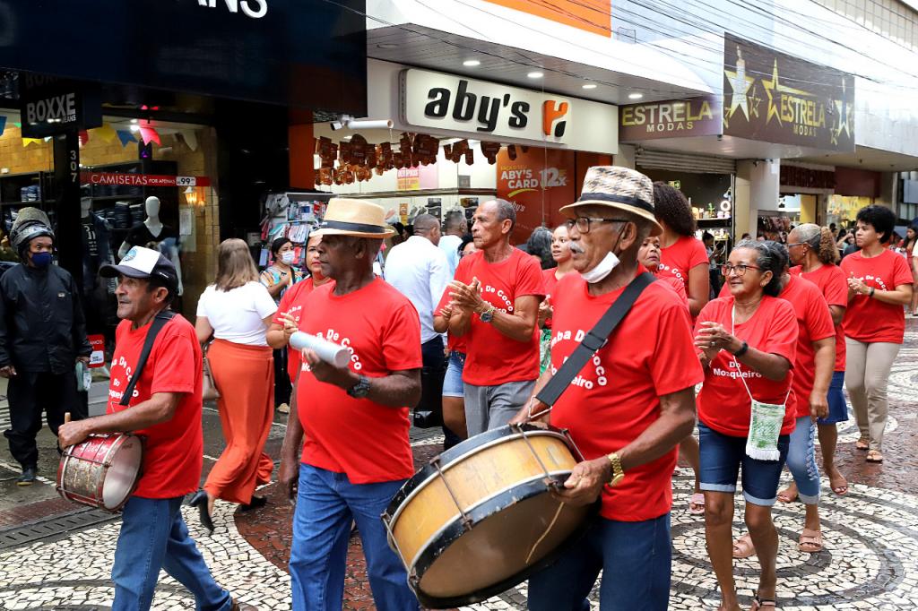 O cortejo foi liderado pelo Samba de Coco do Mosqueiro, que fez o trajeto dançando e cantando músicas tradicionais, contagiando quem estava no caminho, apesar do tempo nublado. “A gente está muito animado em poder voltar a fazer uma festa como essa, mostrando que o samba de coco, que tem 53 anos de história, é um legado”, aponta o Mestre Dió, líder do grupo.