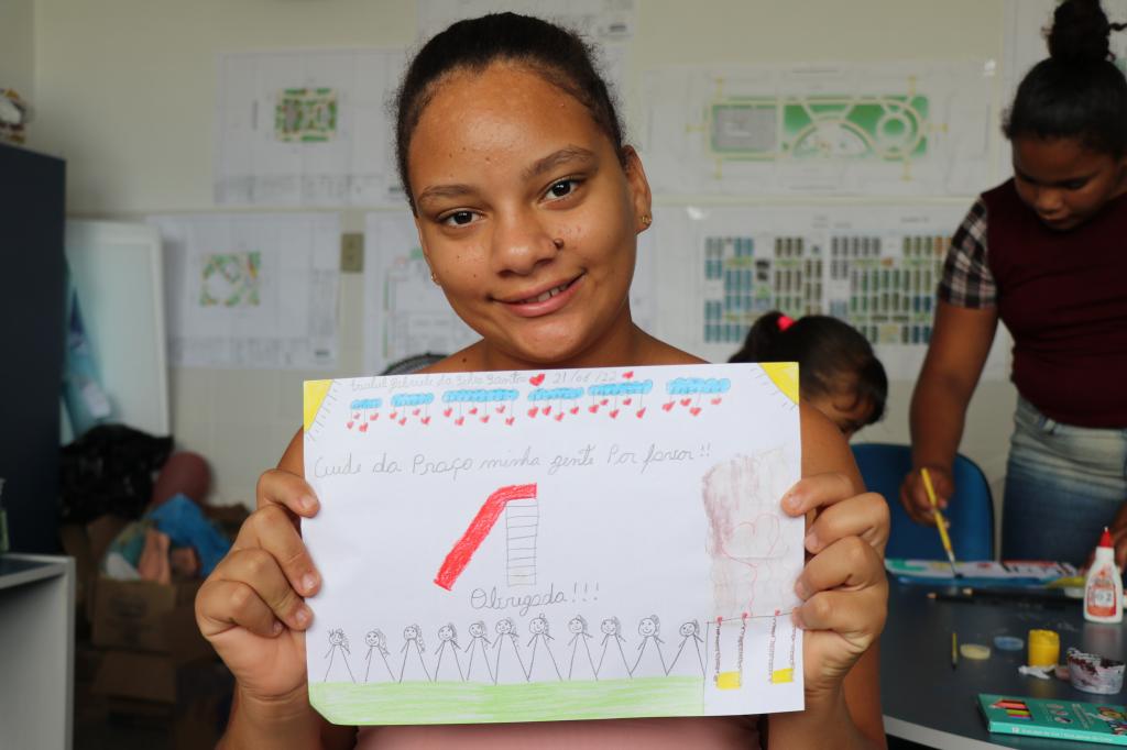 A estudante da Emef José Souza de Jesus, Noemi Ariany Silva, de 11 anos, não concorda com as depredações feitas em uma praça próximo à sua casa porque a impede de viver em comunidade.
