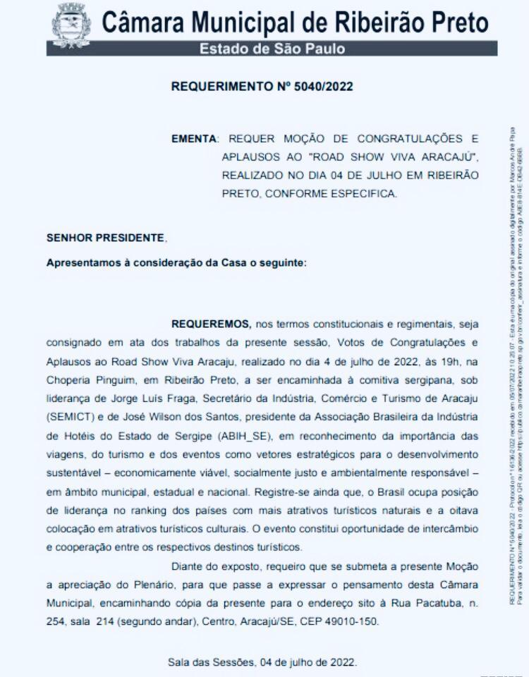 Esse trabalho de divulgação da capital sergipana, realizado nos roadshows Viva Aracaju, recebeu o reconhecimento da Câmara de Vereadores de Ribeirão Preto/SP, por meio de uma Moção de Congratulações e Aplausos, propositura de iniciativa do vereador paulista Marcos Papa (Podemos).