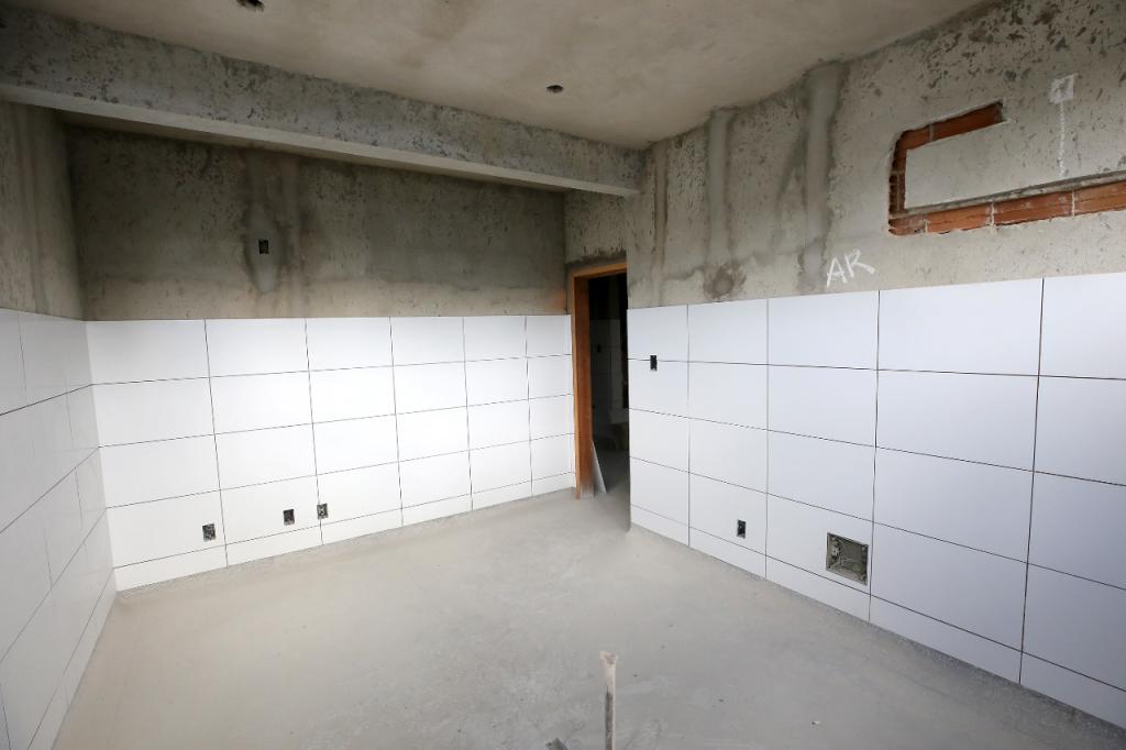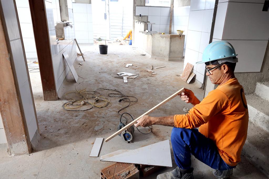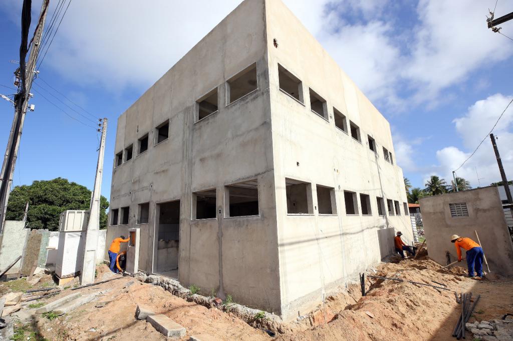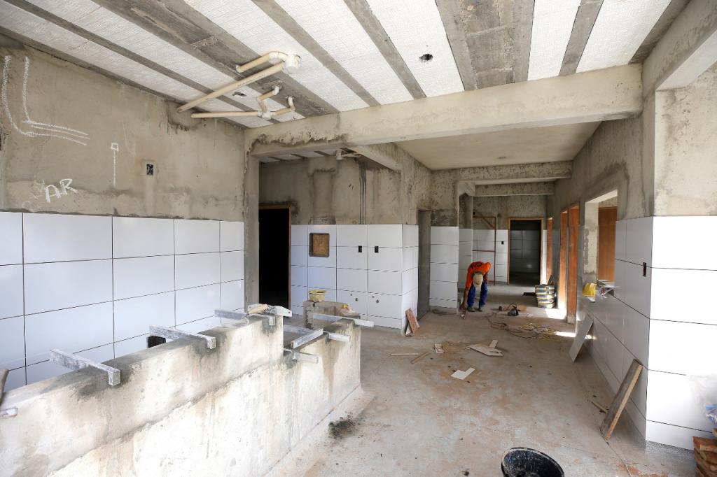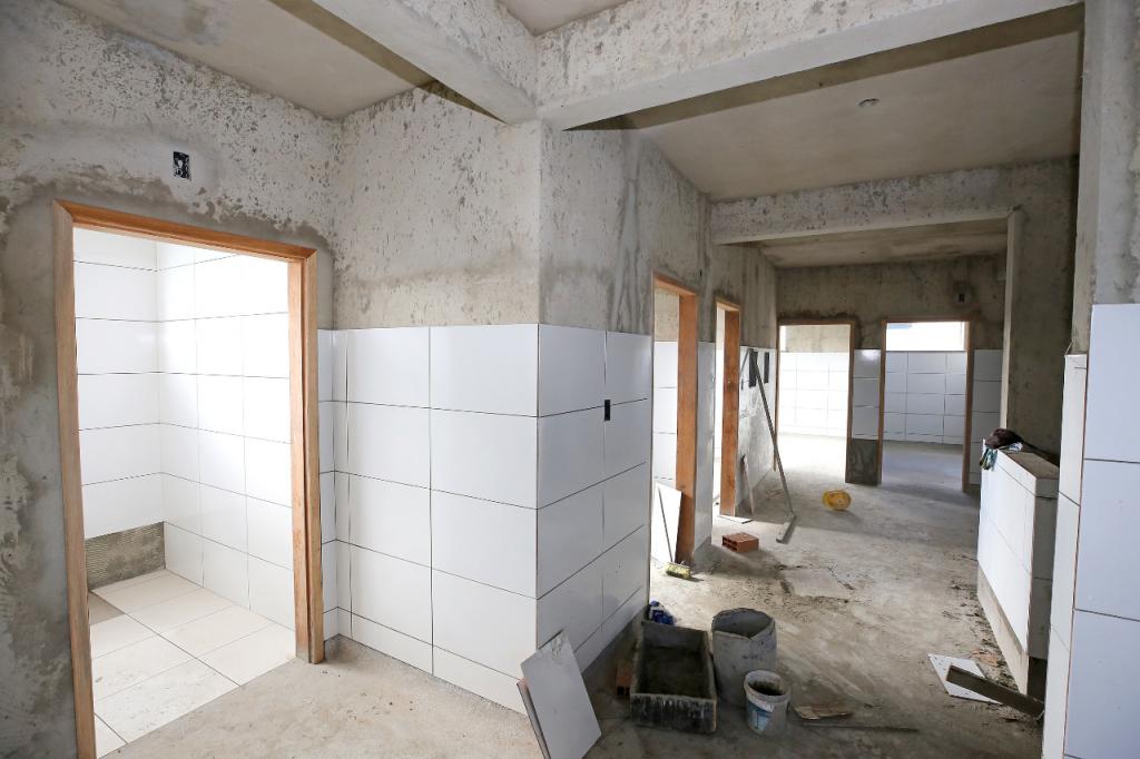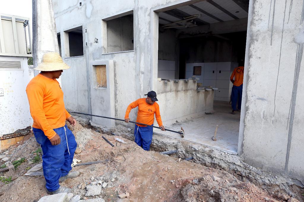 A obra está em fase de implantação das instalações sanitárias e da rede de drenagem pluvial, escavações para colocar tubulação e caixas de passagem, além de aplicar revestimento cerâmico nas paredes, preparar a execução das calçadas e rebocar a casa de lixo da unidade.