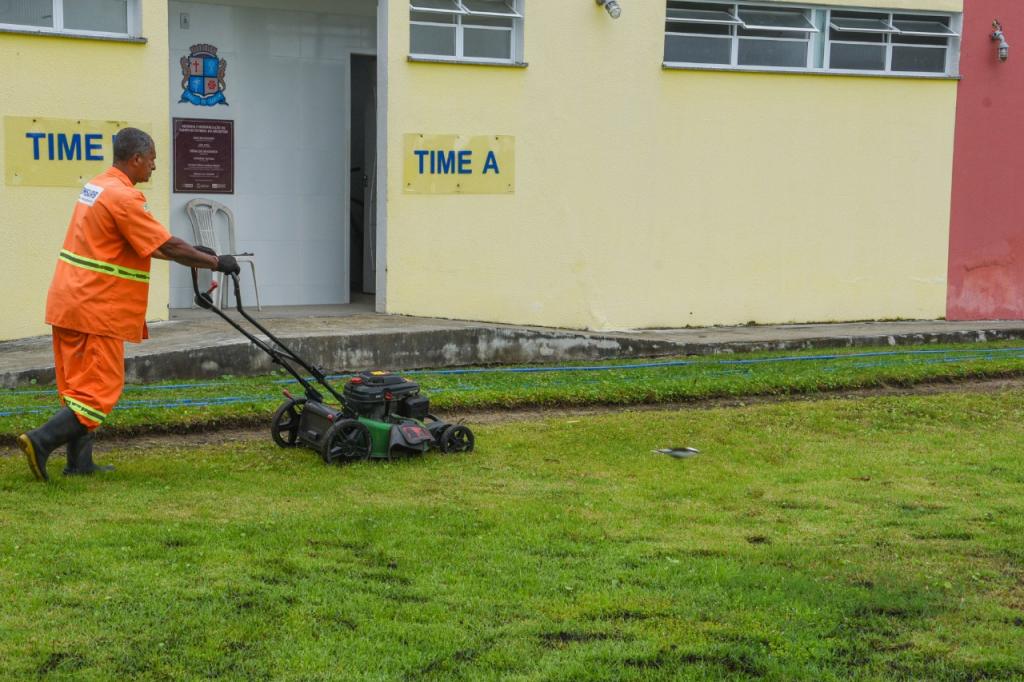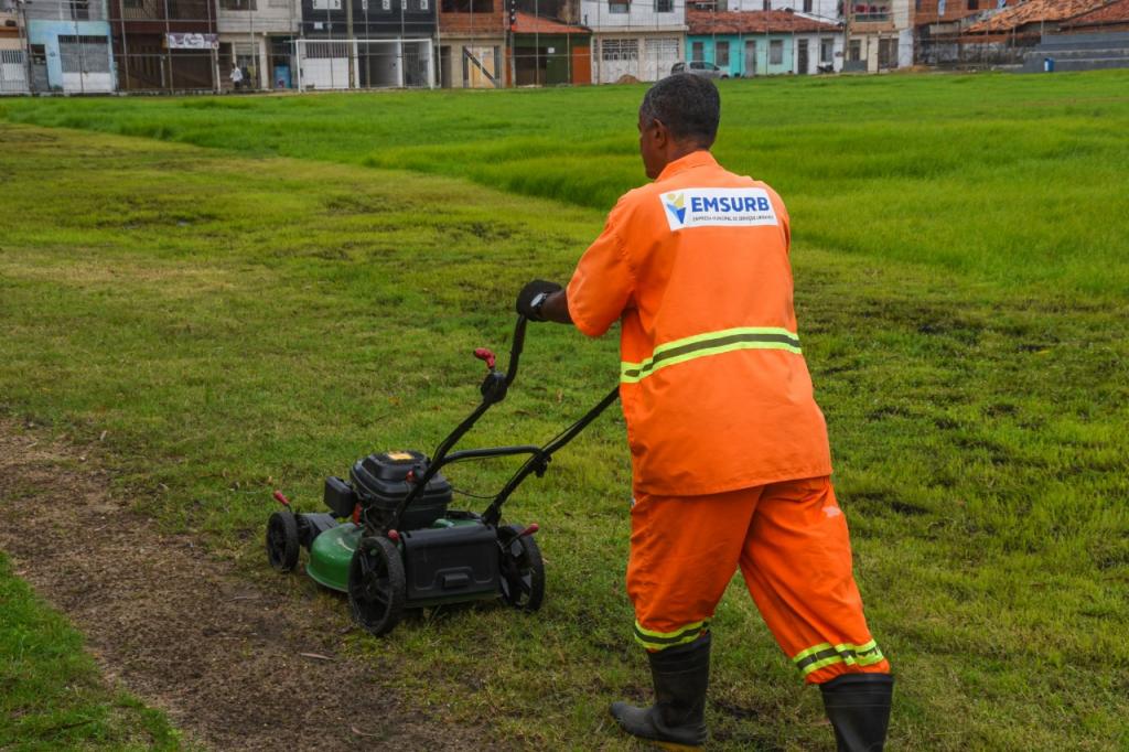 Nesta sexta-feira, 22, agentes da Emsurb fizeram a roçagem mecanizada no gramado e capinação nos canteiros do campo do Anchietão.