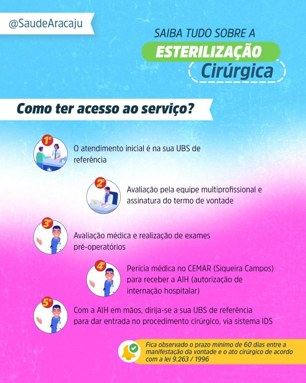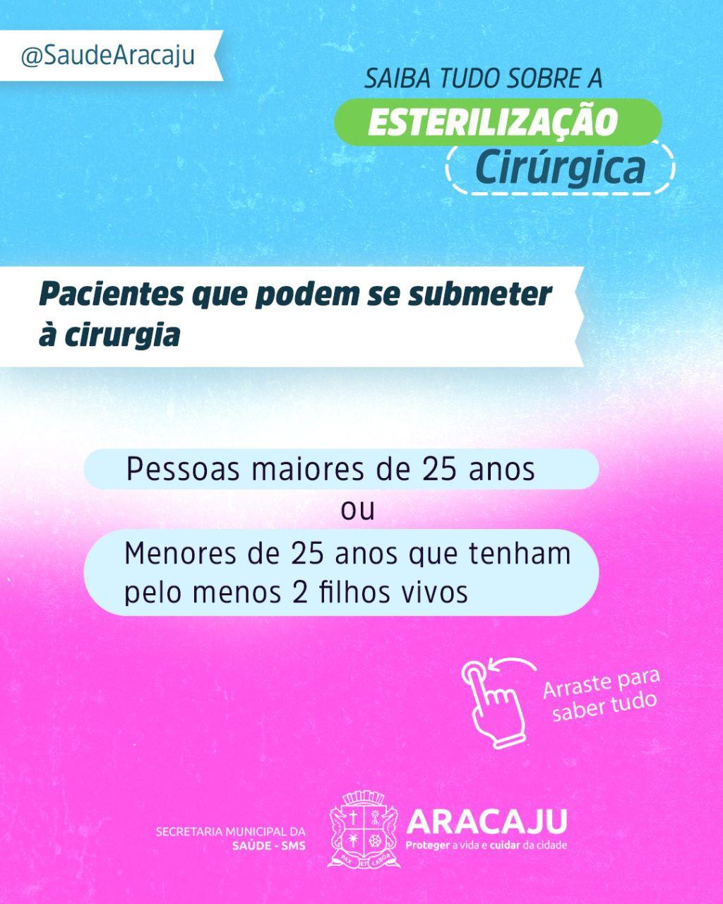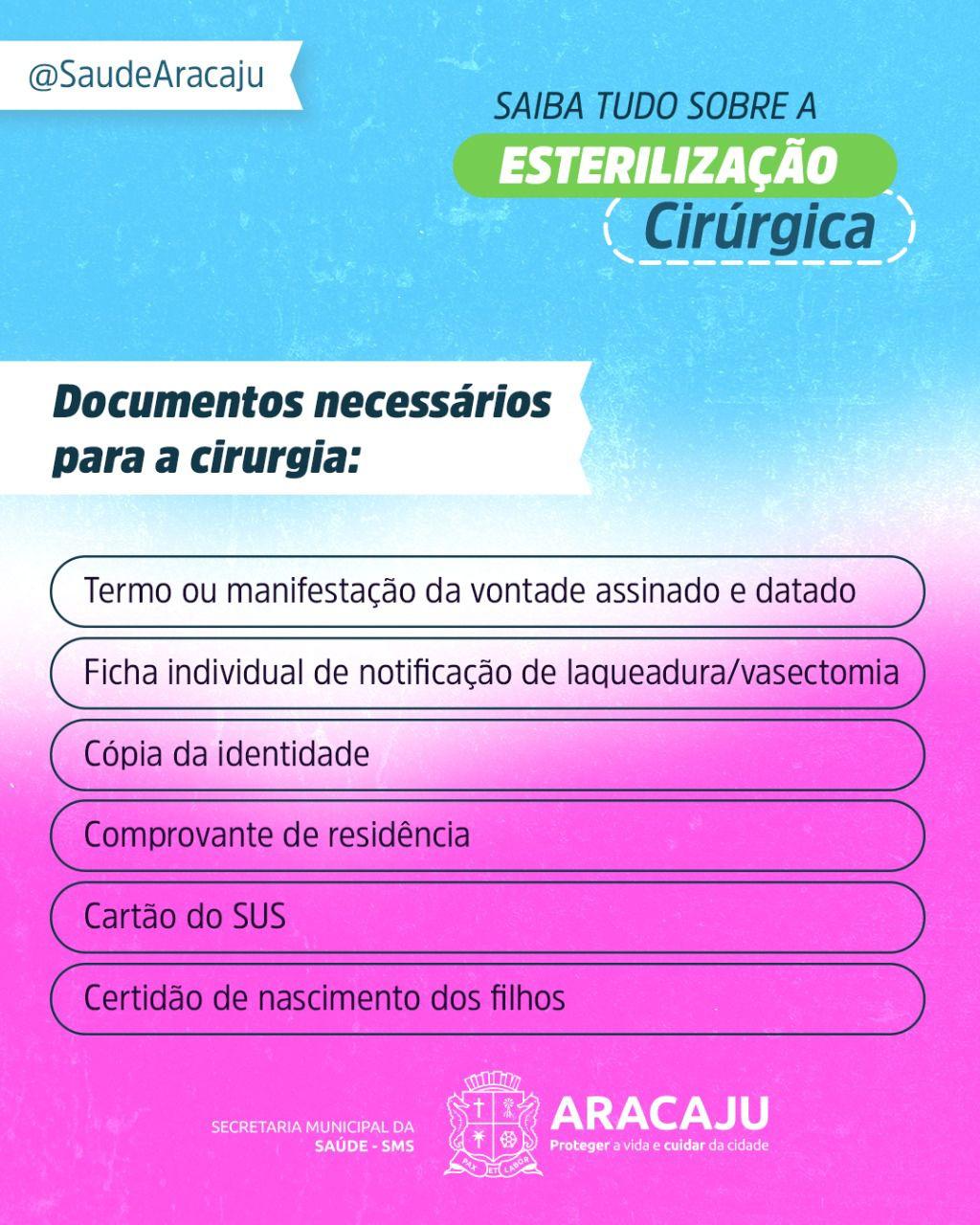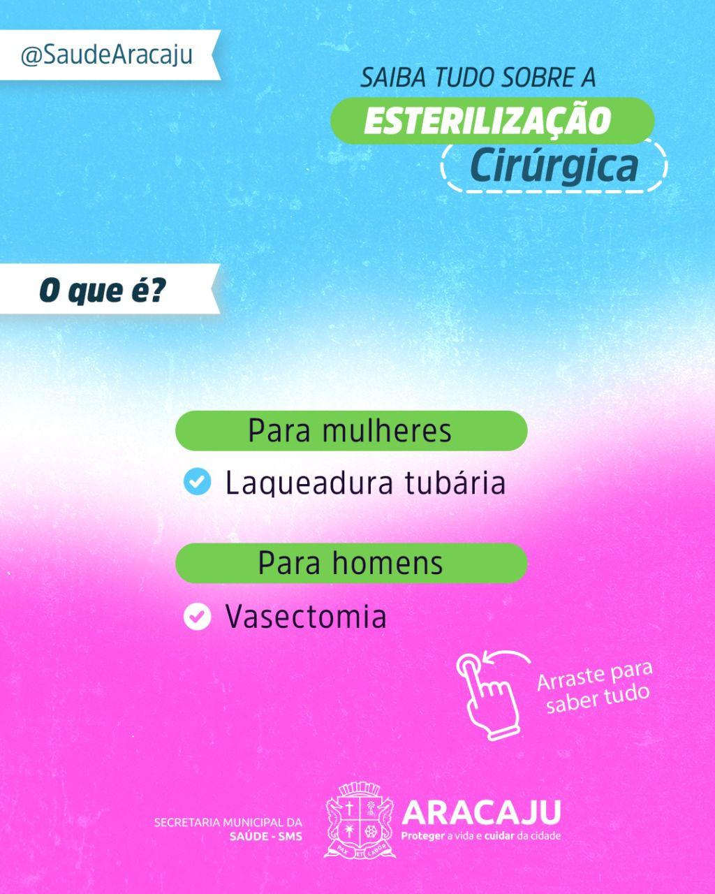 A Prefeitura de Aracaju, por meio da Secretaria Municipal da Saúde (SMS), oferece o serviço de esterilização cirúrgica de homens (vasectomia) e mulheres (laqueadura tubária). Os atendimentos têm início nas Unidades Básicas de Saúde (UBS), onde é realizada a primeira avaliação.