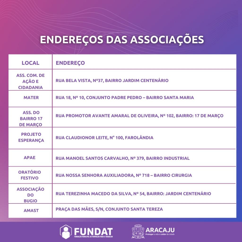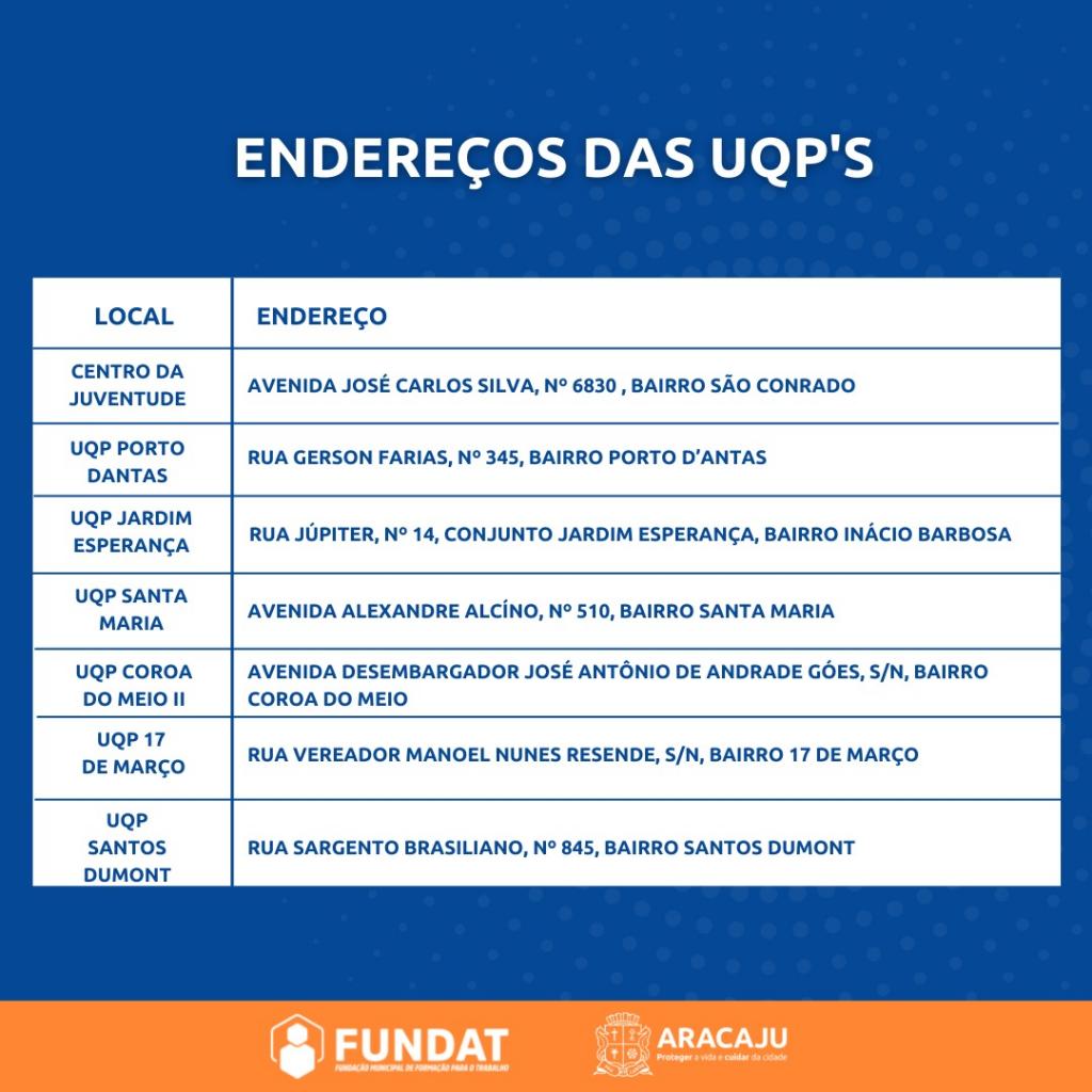 A partir desta terça-feira, 2, a Prefeitura de Aracaju, por intermédio da Fundação Municipal de Formação para o Trabalho (Fundat), abre inscrições para 510 vagas ofertadas para 15 turmas, 14 cursos e uma oficina, todos na modalidade presencial.