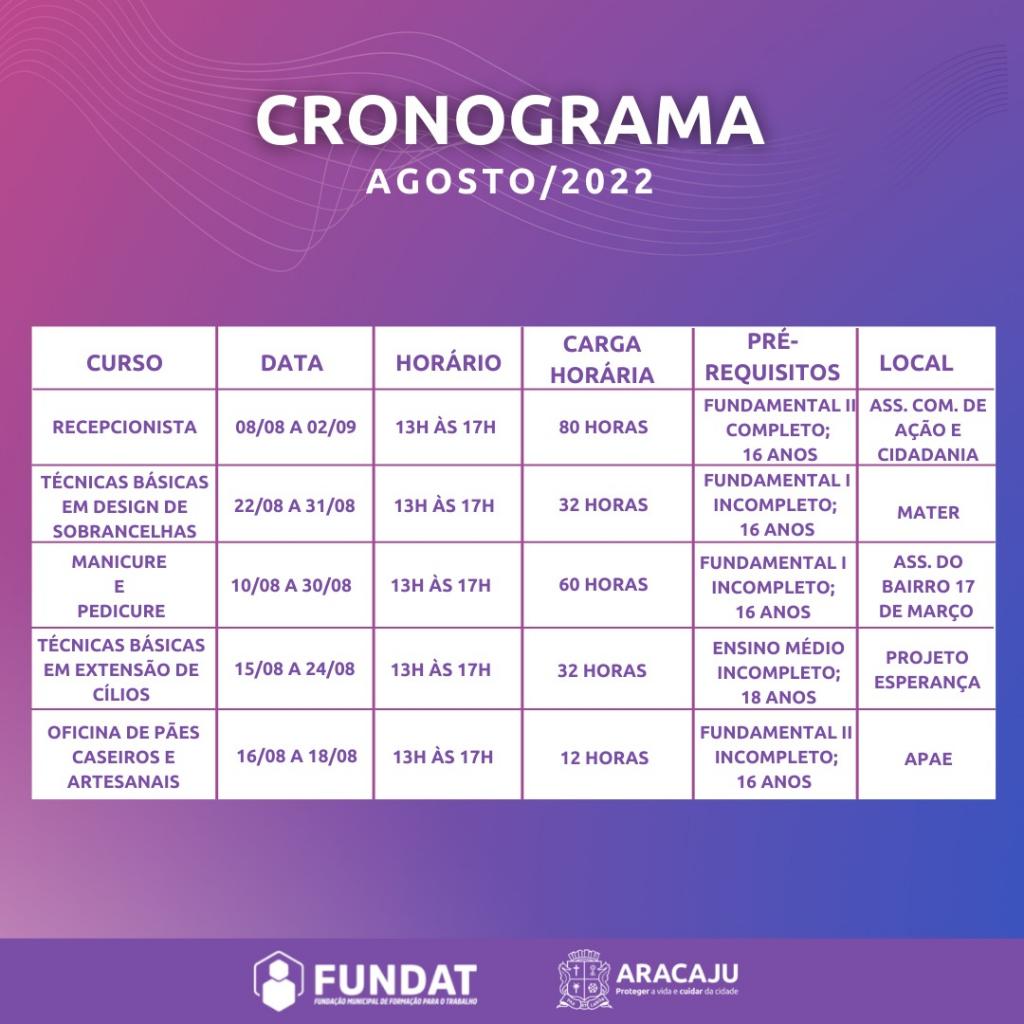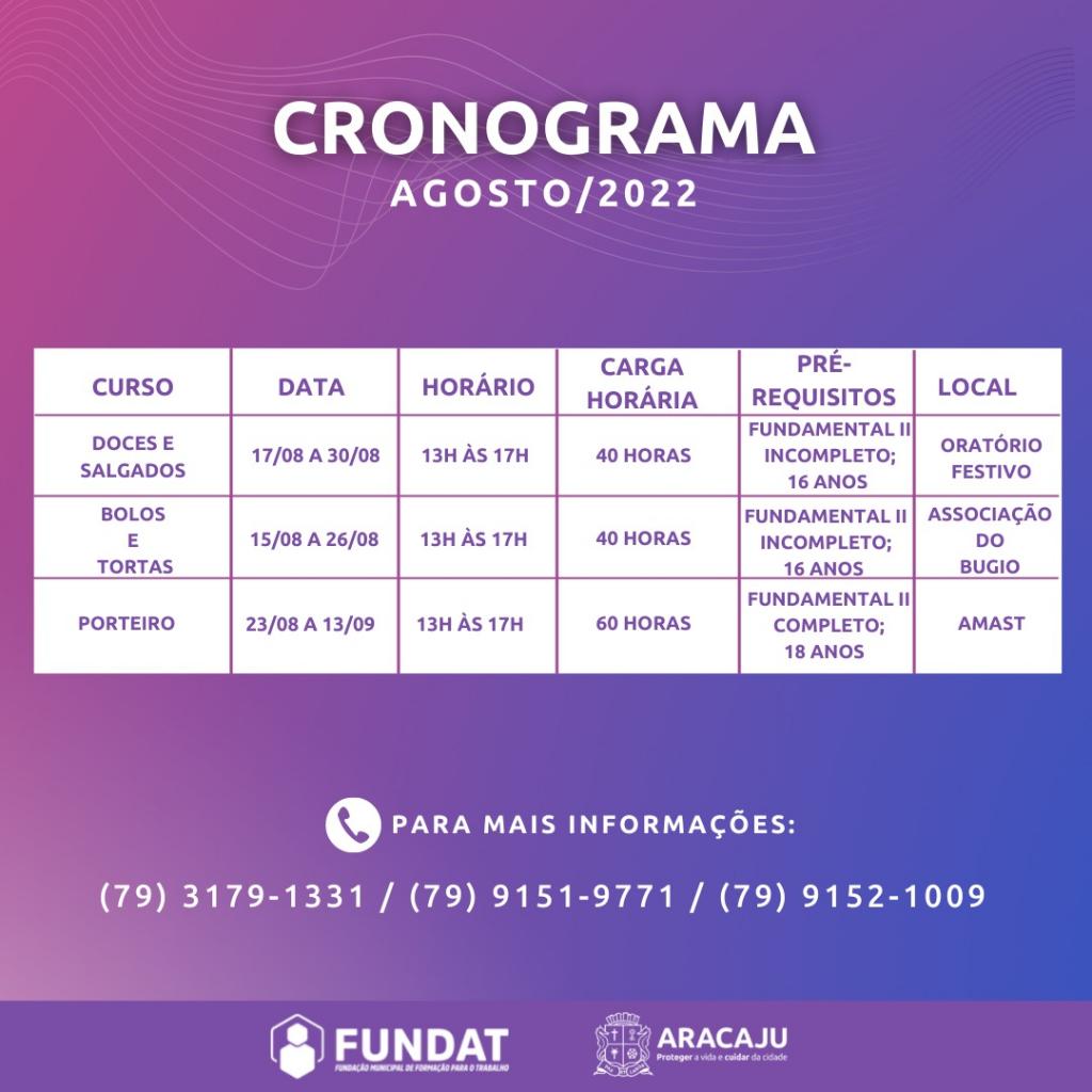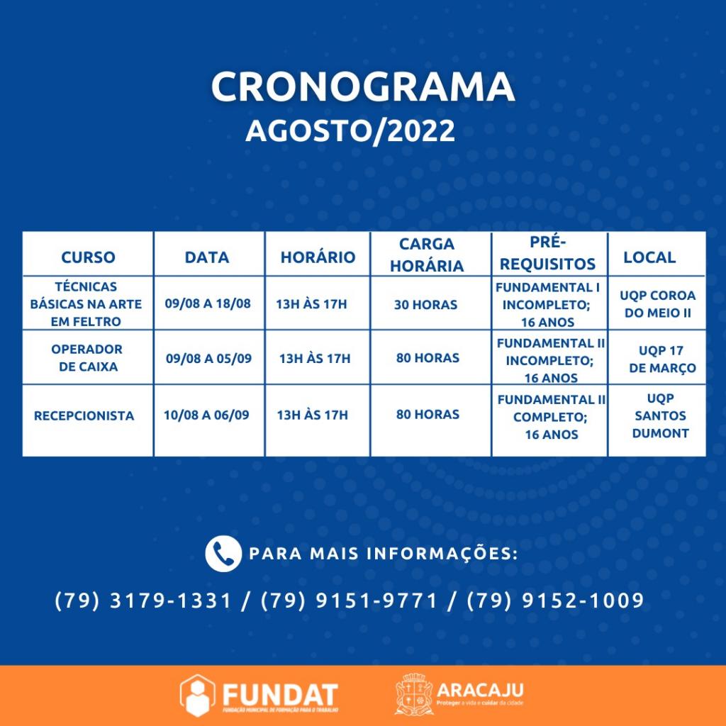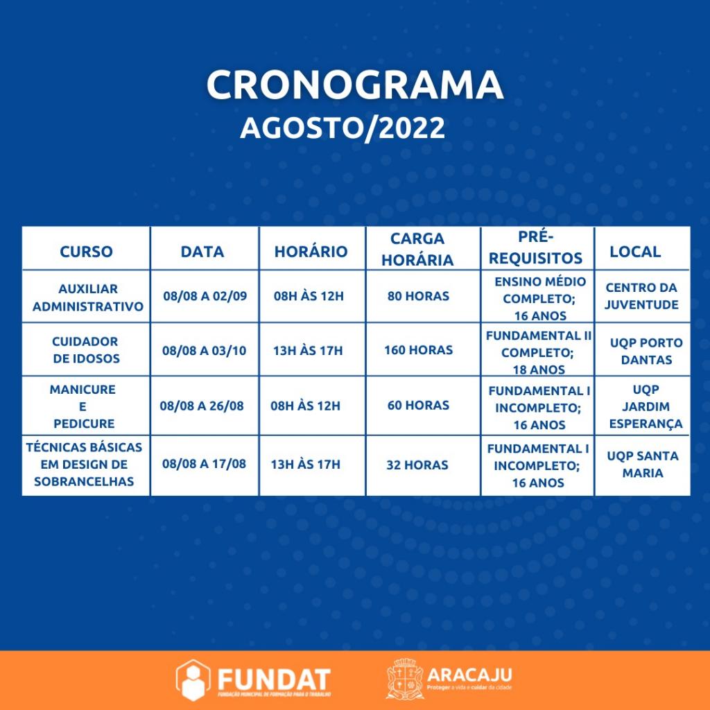 Auxiliar Administrativo | Período: 08/08/22 a 02/09/22 | Horário: 8h às 12h | Carga horária: 80h | Pré-requisitos: ensino médio completo; a partir de 16 anos; Local: Centro da Juventude | Endereço: Praça da Juventude, s/n, Conj. Augusto Franco, bairro: Farolândia;