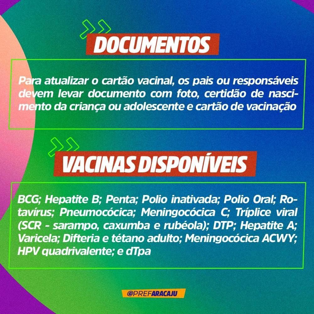 “Essas campanhas vêm para estimular a vacinação das crianças e adolescentes que estejam com algum esquema vacinal incompleto, atualizando a caderneta de vacinação. O município tem atuado com diversas estratégias para a campanha contra a covid-19, mas é fundamental que as crianças também estejam protegidas contra as demais doenças, e a vacina é a melhor proteção”, declara a secretária da Saúde de Aracaju, Waneska Barboza.