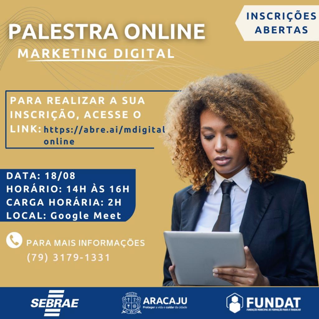 A Prefeitura de Aracaju, por meio da parceria entre a Fundação Municipal de Formação para o Trabalho (Fundat) e o Serviço Brasileiro de Apoio à Micro e Pequenas Empresas (Sebrae), está com inscrições abertas para a palestra online sobre Marketing Digital, que acontecerá no dia 18 de agosto, das 14h às 16h, na plataforma Google Meet.