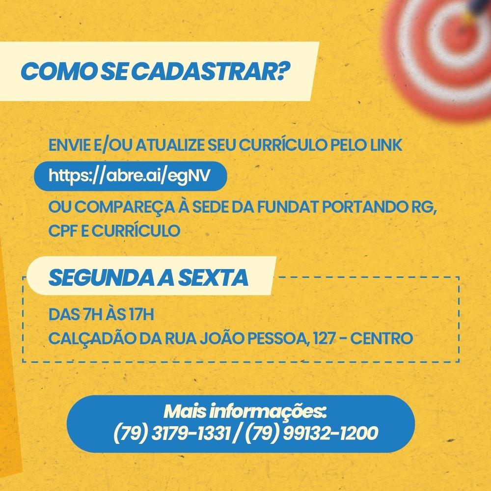 Os interessados em se candidatar para participar dos processos seletivos referentes às vagas disponíveis, podem cadastrar e/ou atualizar o currículo através do link https://abre.ai/egNV ou comparecer à sede da Fundat, no calçadão da rua João Pessoa, 127, Centro, portando RG, CPF e currículo, ou ainda pelo número (79) 9 9132-1200.