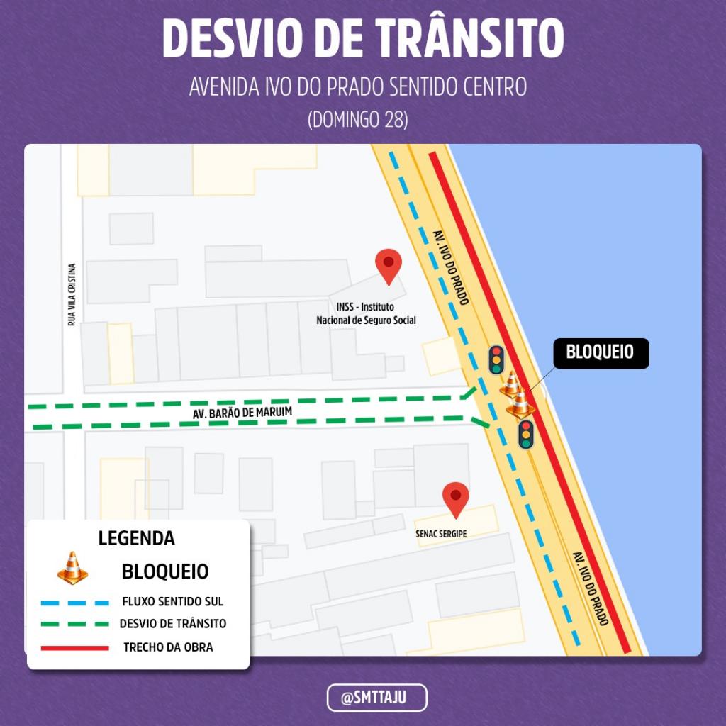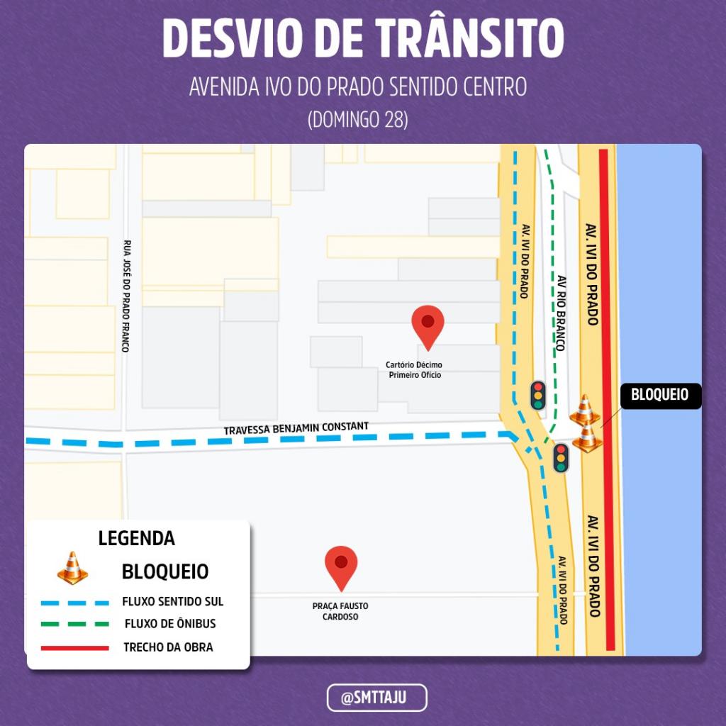 O bloqueio será feito no sentido Centro da avenida, no trecho que vai da rua Campos (após a OAB) até o espaço Zé Peixe. Sendo assim, o trânsito será desviado para a rua Campos e os condutores que estiverem na avenida Barão de Maruim e na travessa Benjamin Constant não poderão acessar a avenida Ivo do Prado em direção aos Mercados Centrais. Por isso, ao acessar a rua Campos, o condutor seguirá pela rua Itabaiana em direção ao Centro da cidade. Agentes da SMTT estarão na região, fazendo os bloqueios e orientando os condutores.