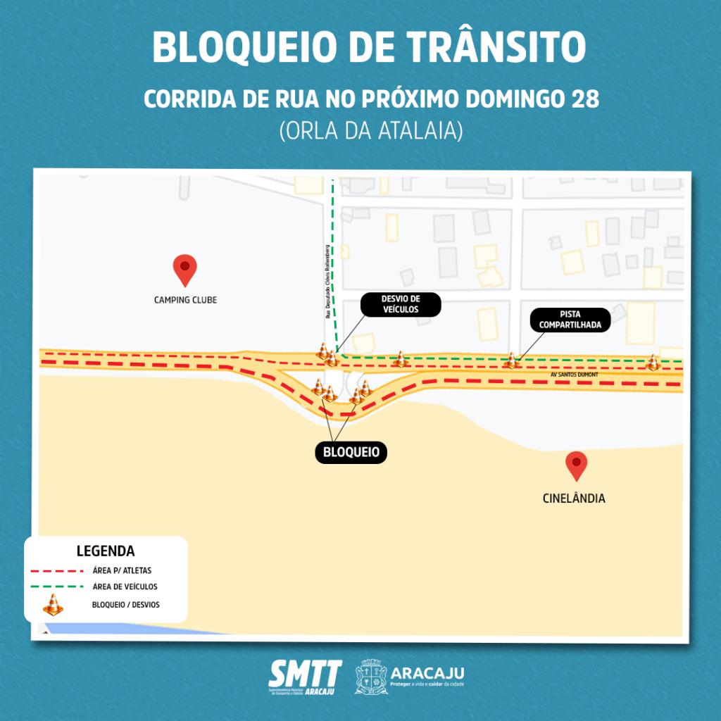 A Superintendência Municipal de Transportes e Trânsito (SMTT) de Aracaju informa que, no próximo domingo, 28, o trânsito na avenida Santos Dumont, na Orla da Atalaia, ficará bloqueado das 5h às 9h para realização de uma corrida de rua, e também das 13h às 22h para realização de um evento festivo.