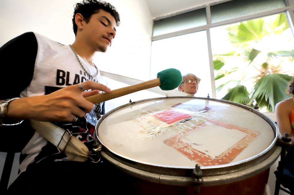 “Estou na oficina desde o início do ano, começamos as aulas pouco depois do carnaval. Sempre me interessei muito por música, em todas as áreas, e já tinha ouvido falar muito bem do professor Pequeno, que é uma referência para os percussionistas. Eu vejo música como uma extensão, que circunda a gente o tempo todo, está presente na vida de todo mundo, então fiz piano aqui também. É um espaço que me faz sentir bem”, comenta Lorena.