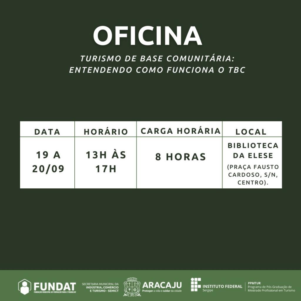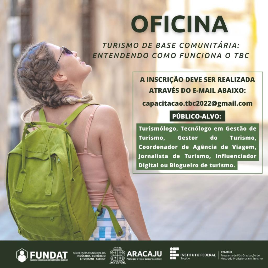 Prosseguindo com a oferta de qualificação profissional destinada aos profissionais que atuam no segmento turístico da capital, a Prefeitura de Aracaju, por meio da Secretaria Municipal da Indústria, Comércio e Turismo (Semict) e da Fundação Municipal de Formação para o Trabalho (Fundat), abre inscrições, a partir desta segunda, 29, para a oficina presencial intitulada “Turismo de Base Comunitária: entendendo como funciona o TBC”.