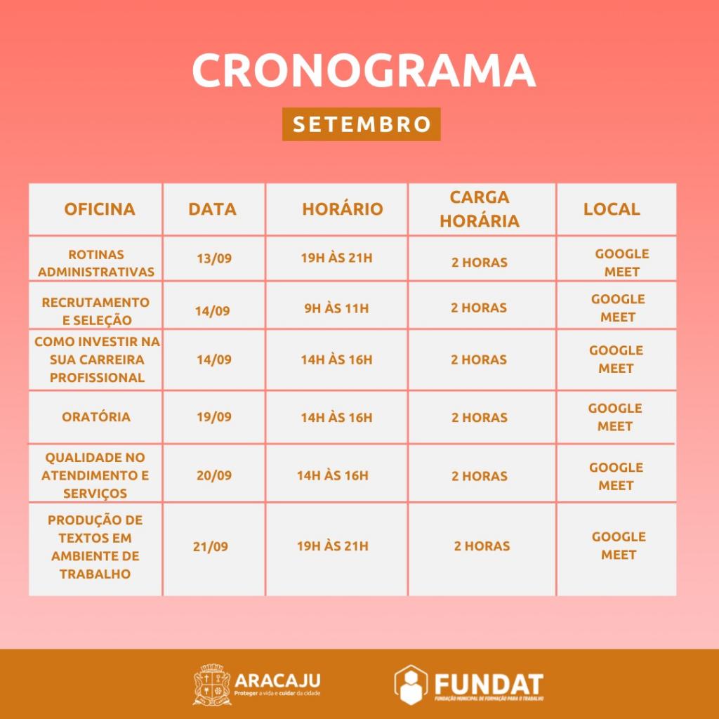 Para realizar a inscrição nos cursos online, os cidadãos devem acessar o link https://abre.ai/cursosonsetembro e preencher o formulário corretamente. Já para efetuar a matrícula nas oficinas online, é necessário acessar o link https://abre.ai/oficinasonsetembro e fornecer os dados adequadamente. Os links de acesso aos formulários de inscrições para ambas modalidades também estão disponíveis a partir da bio do perfil da Fundat no Instagram - @fundataracaju.