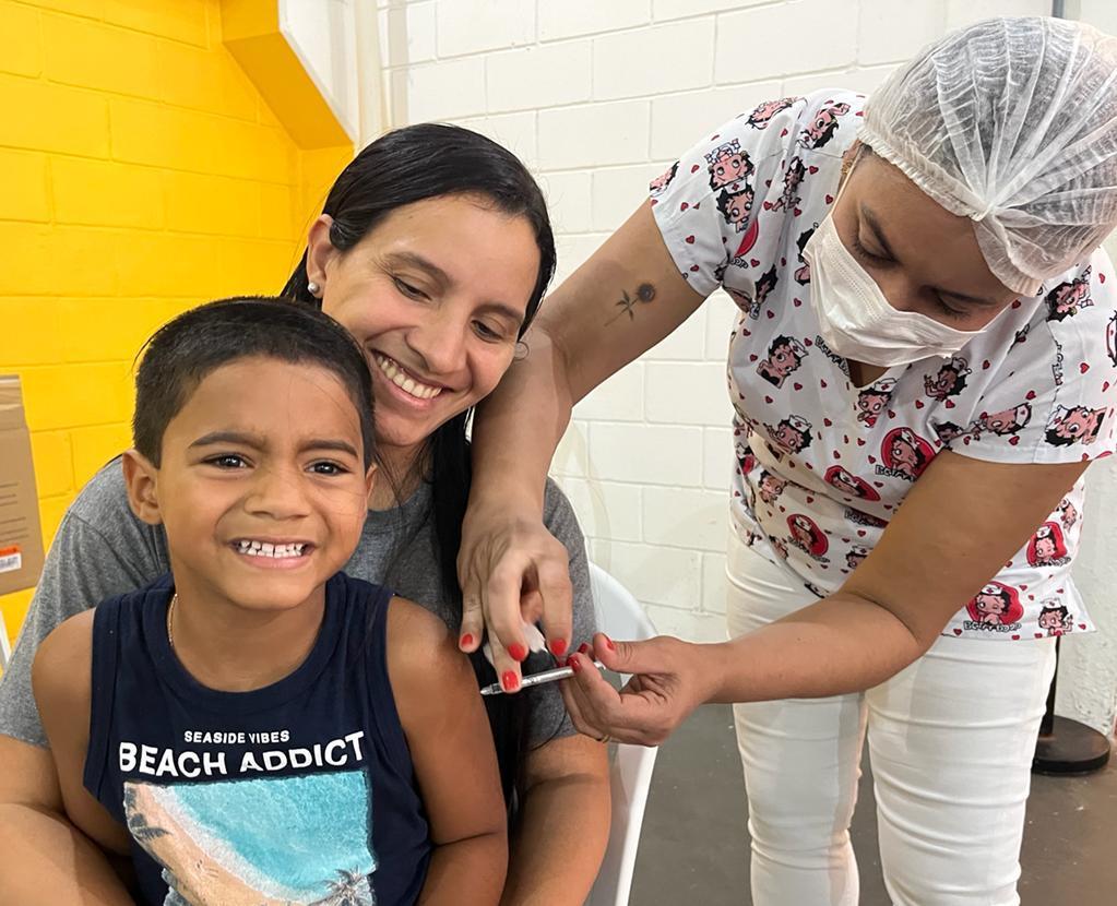 Ao longo do dia, das 10h às 16h, crianças receberam a vacina contra a pólio, como o pequeno Miguel, de 4 anos. Sua mãe, Jéssica Santos, aproveitou para receber a dose de reforço contra a covid-19.