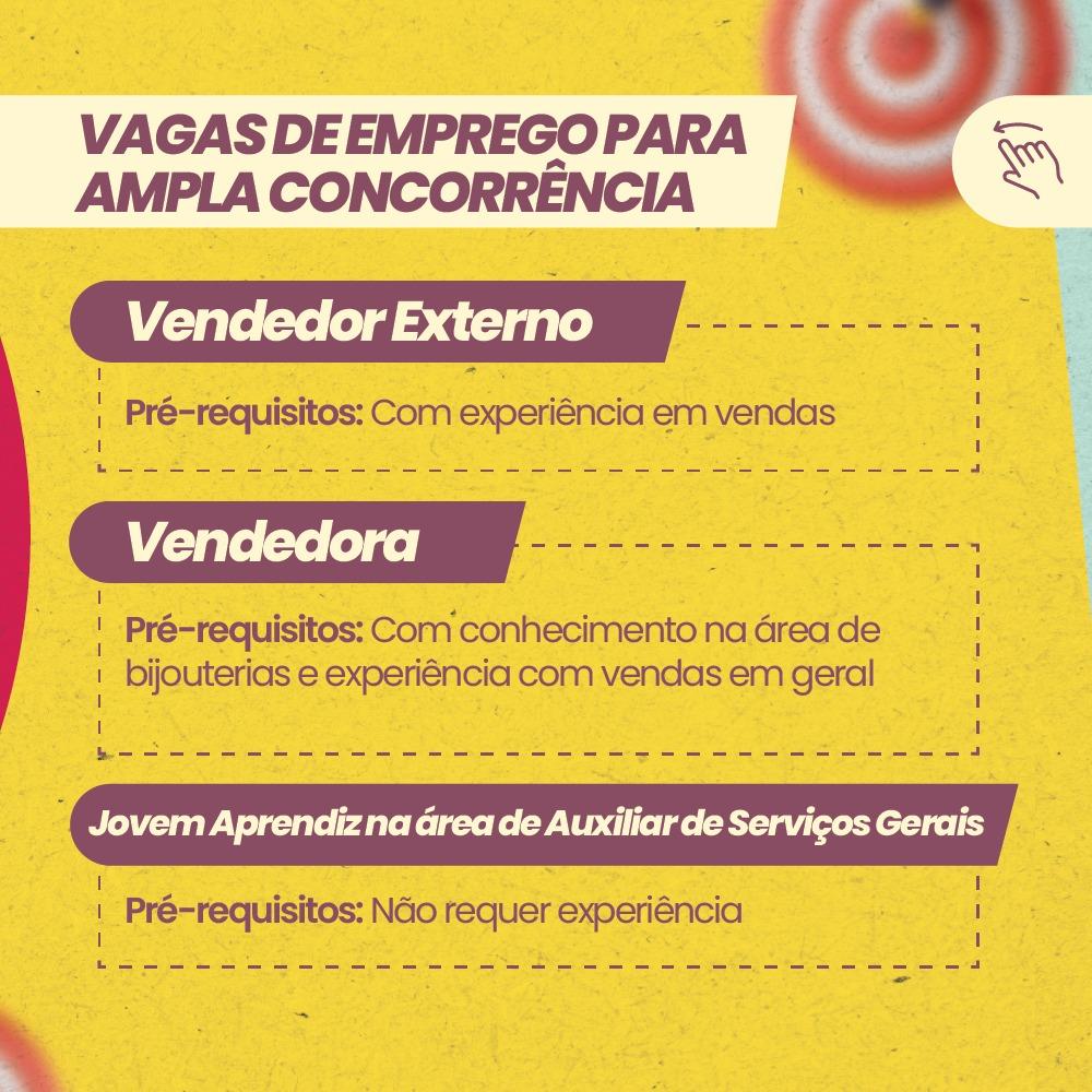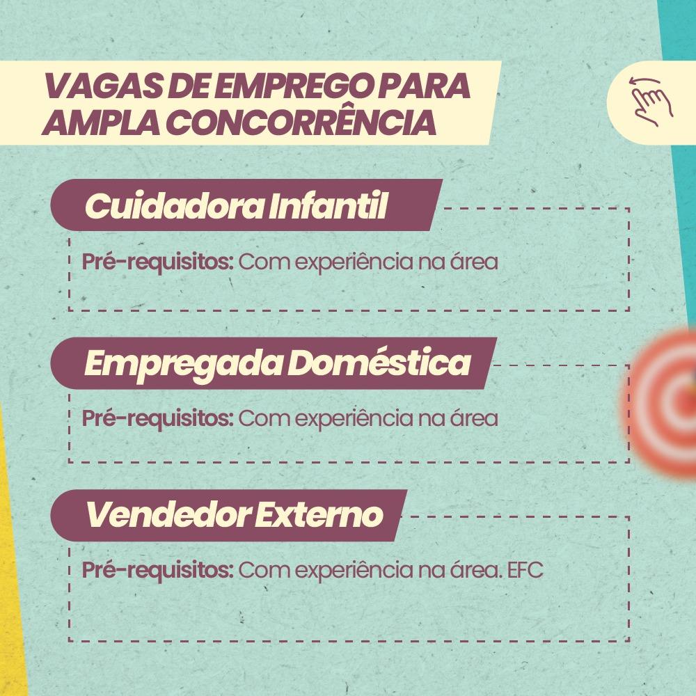 Desta vez, as oportunidades para a ampla concorrência são voltadas para vendedor externo, cuidadora infantil, empregada doméstica, manicure e pedicure, operador de caixa, técnico de informática, vendedor e também para jovem aprendiz na área de serviços gerais.