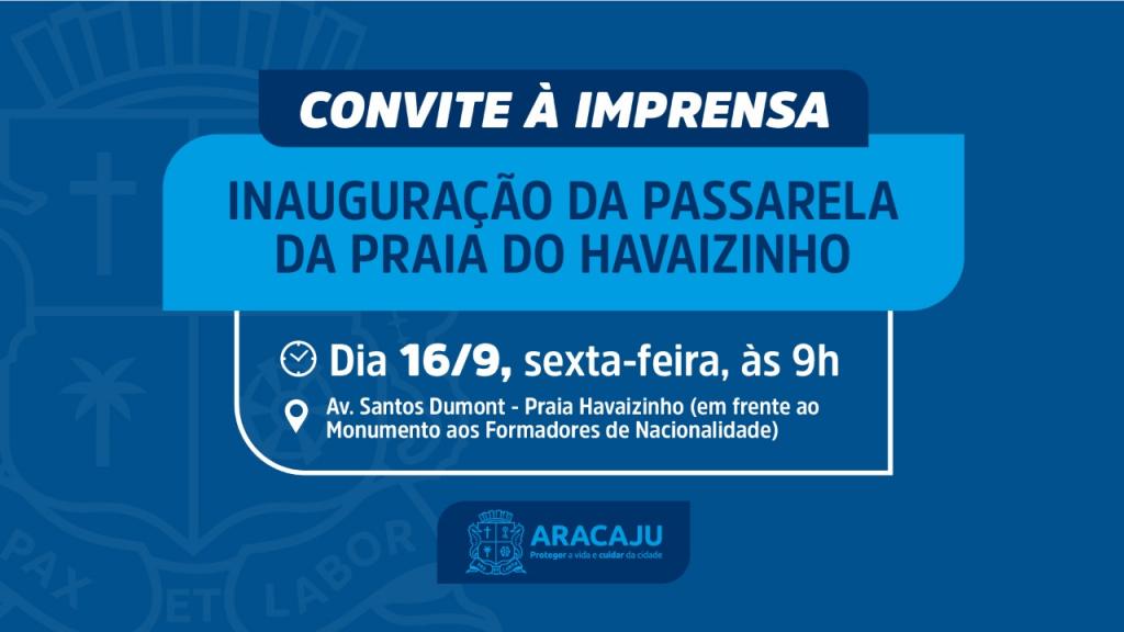 A Prefeitura de Aracaju convida a imprensa para o ato de inauguração da revitalização da passarela do Havaizinho, na Orla da Atalaia, que será realizado nesta sexta-feira, dia 16, às 9h, pelo prefeito Edvaldo Nogueira e pelo presidente da Empresa Municipal de Serviços Urbanos (Emsurb), Burno Moraes.