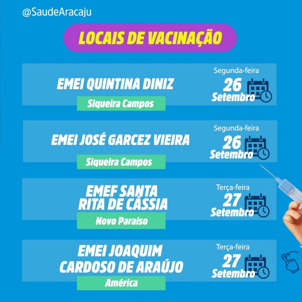 Com o objetivo de reforçar a importância da vacinação na proteção da população e fomentar a ampliação da cobertura vacinal, a Prefeitura de Aracaju, por meio das secretarias municipais da Saúde (SMS) e da Educação (Semed), dá continuidade, a partir desta segunda-feira, 26, a vacinação contra poliomielite e covid-19 nas escolas municipais de Educação Infantil (Emeis) e creches. A ação segue até o dia 21 de outubro. Podem ser vacinadas crianças a partir dos 6 meses de idade, pais, professores e funcionários das escolas e creches.