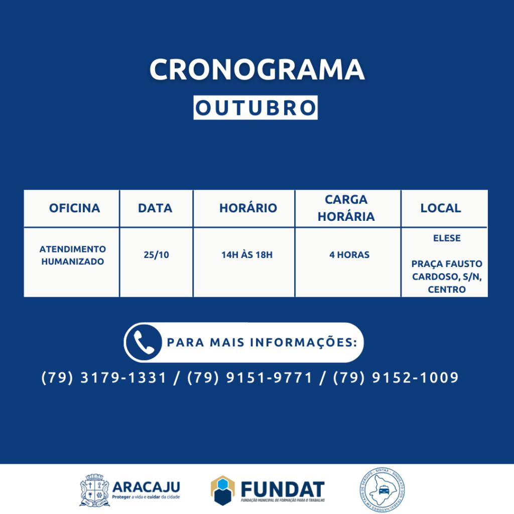 Oficina Atendimento Humanizado | Horário: 14h às 18h | Data: 25/10 | Carga horária: 4h | Público-alvo: Taxistas | Modalidade: Presencial | Local: Elese | Endereço: Praça Fausto Cardoso, S/N, Centro;