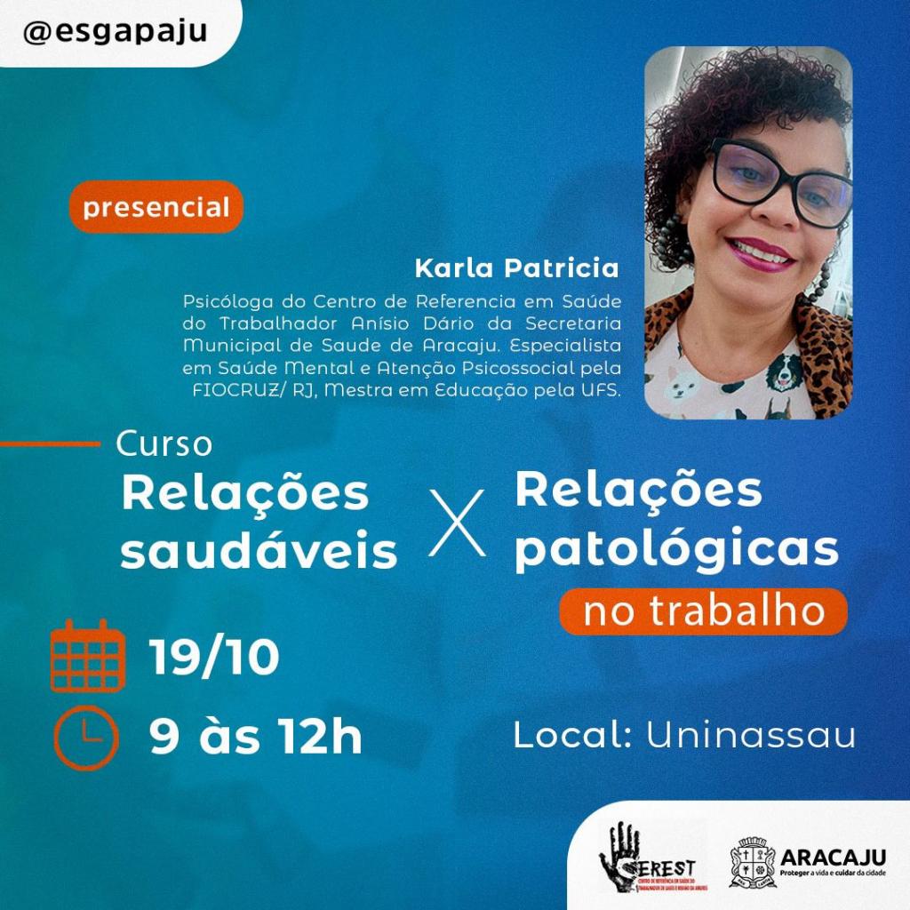 A Escola de Gestão e Administração Pública (Esgap) realiza, nesta quarta-feira, 19, das 9h às 12h, o curso “Relações saudáveis x Relações patológicas no trabalho”, ministrado pela psicóloga Karla Patrícia. O encontro vai acontecer no Centro Universitário Maurício de Nassau (Uninassau), e é direcionado aos servidores da Prefeitura de Aracaju.