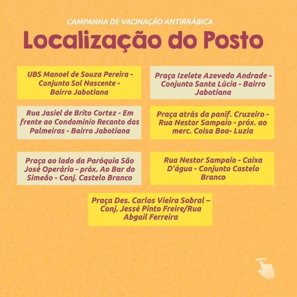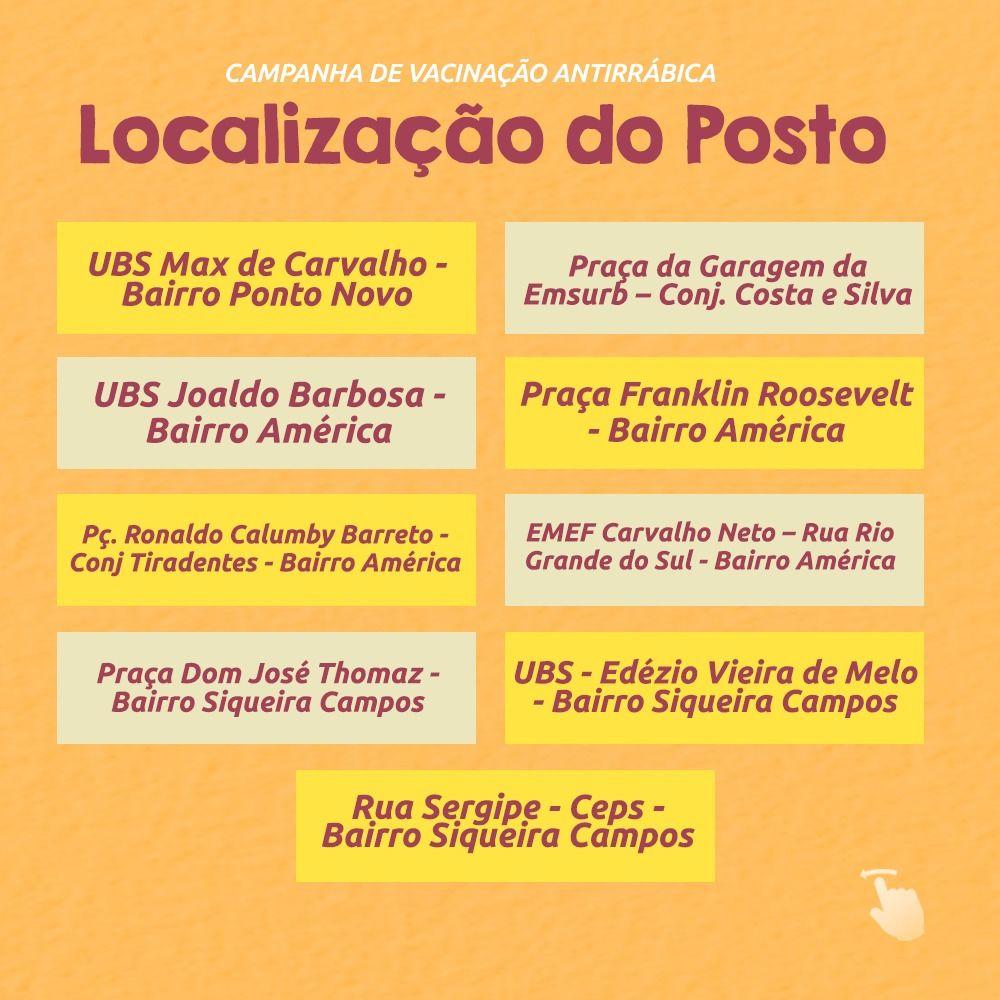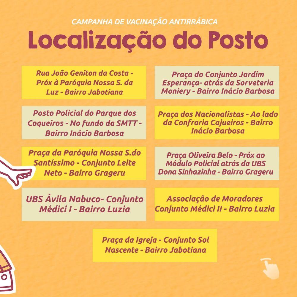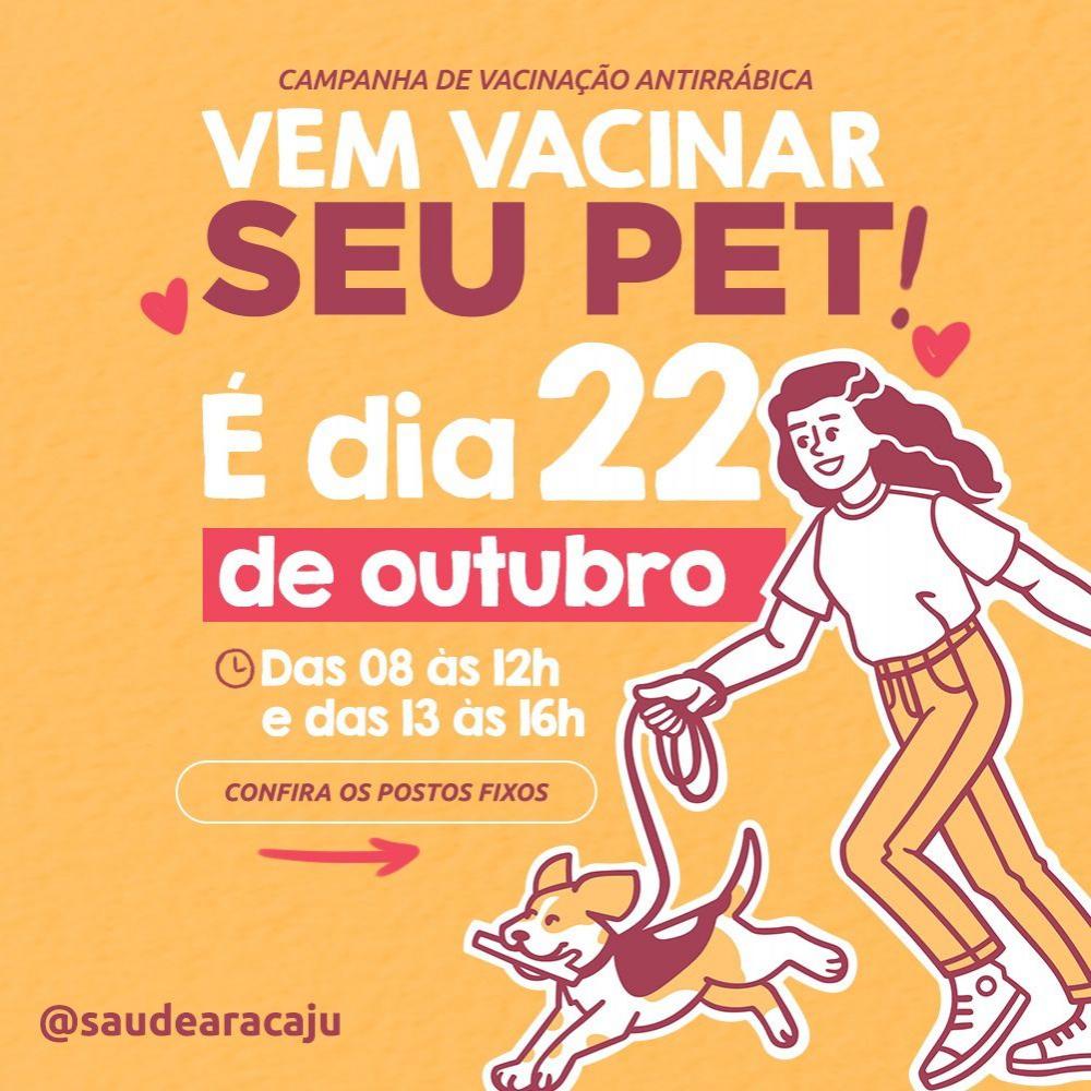 Em continuidade à Campanha Antirrábica, a Prefeitura de Aracaju, por meio da Secretaria Municipal da Saúde (SMS), realiza neste sábado, 22, o segundo dia de Postos Fixos das 8h às 12h e das 13h às 16h.