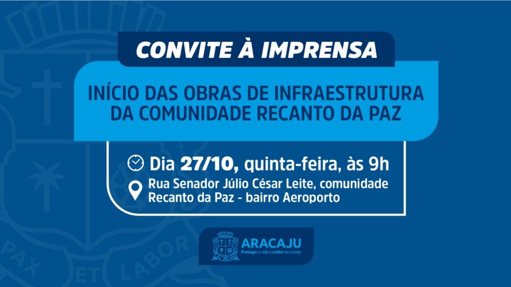 A Prefeitura de Aracaju convida a imprensa para acompanhar o início das obras de infraestrutura da comunidade Recanto da Paz, nesta quinta-feira, dia 27, às 9h, no bairro Aeroporto.