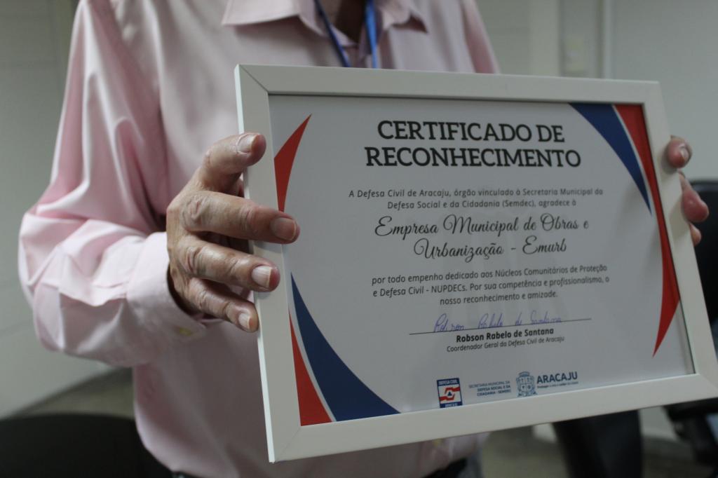 A Empresa Municipal de Obras e Urbanização (Emurb), através do presidente Sérgio Ferrari, recebeu da Defesa Civil de Aracaju um certificado de reconhecimento pela colaboração e serviços prestados às comunidades aracajuanas em parceria com os Núcleos Comunitários de Proteção e Defesa Civil (Nudpecs).