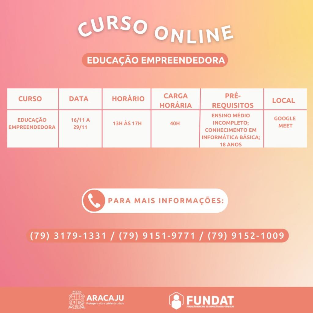 Para realizar inscrição, os interessados devem acessar o link https://abre.ai/cursoeducacaoempreendedoraonline e preencher corretamente o formulário com as informações solicitadas. Também é possível se inscrever a partir da Bio do perfil da Fundat no Instagram - @fundataracaju. É necessário que preencham os pré-requisitos: ter a partir de 18 anos, possuir o ensino médio completo e conhecimento em Informática Básica.