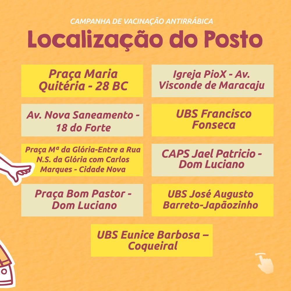 Para finalizar a Campanha Antirrábica, a Prefeitura de Aracaju, por meio da Secretaria Municipal da Saúde (SMS), realiza, neste sábado, 5, o terceiro e ultimo dia de Postos Fixos, das 8h às 12h e das 13h às 16h, na zona Norte. A ação ocorrerá nos bairros 18 do Forte, Cidade Nova, Dom Luciano, Japãozinho, Coqueiral, Porto Dantas, Soledade, Lamarão, Santos Dumont, São Carlos, Veneza, Jardim Centenário, Bugio e conjunto Maria do Carmo.