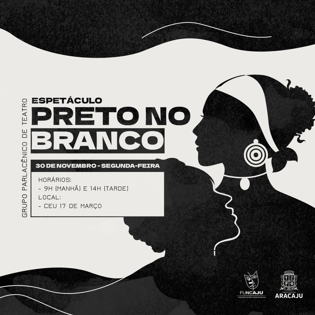 A Prefeitura de Aracaju, através da Fundação Cultural Cidade de Aracaju (Funcaju), realizará, na próxima quarta-feira, dia 30, o espetáculo “Preto no Branco” da Companhia de Teatro ParlaCÊNICO, no Centro de Artes e Esportes Unificados do bairro 17 de Março (CEU).