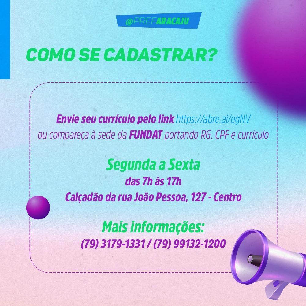 Os interessados precisam preencher os pré-requisitos estabelecidos. Para quem deseja se candidatar aos processos seletivos referentes às vagas disponíveis, basta cadastrar ou atualizar o currículo através do link https://abre.ai/egNV ou comparecendo à sede da Fundat, no calçadão da rua João Pessoa, 127, Centro, portando RG, CPF e currículo, ou ainda pelo número (79) 9 9132-1200.