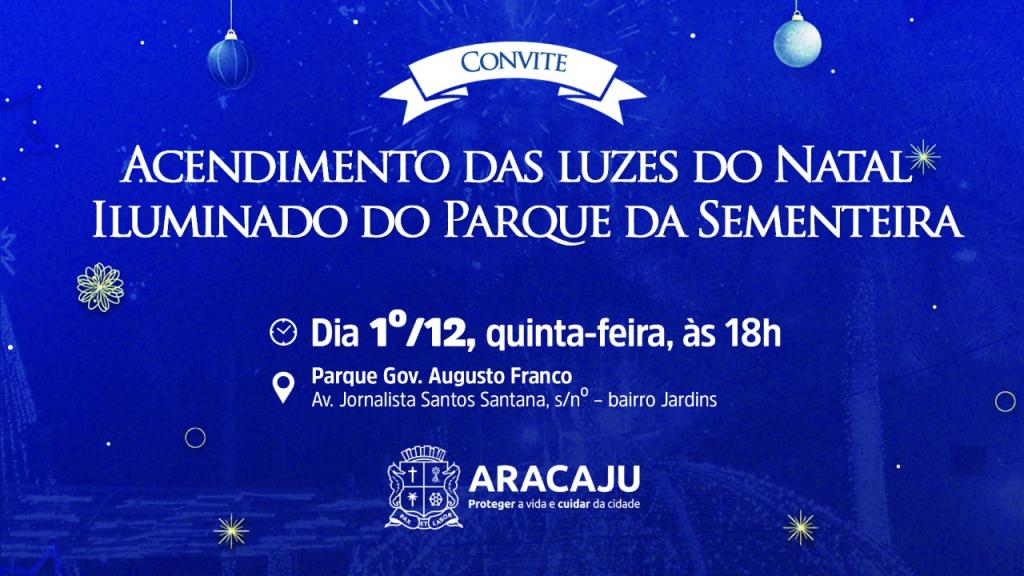 A Prefeitura de Aracaju, em parceria com o Grupo Energisa, convida para o acendimento das luzes do Natal Iluminado do Parque da Sementeira, nesta quinta-feira, dia 1º, às 18h.