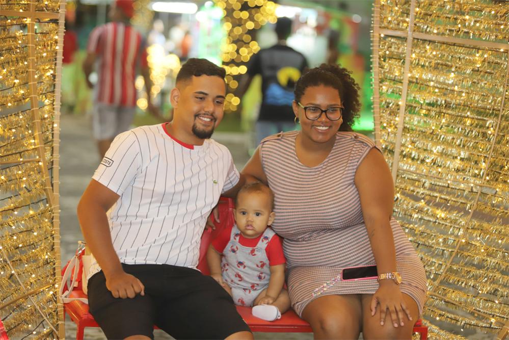 A dona de casa Bruna Kauane e o esposo Filipe Rodrigues vieram de São Cristóvão para apresentar o Natal Iluminado ao pequeno Felipe Kauã, de 9 meses. “Aproveitamos a folga do meu esposo para trazer ele para passear. É a primeira vez que estamos vindo e achei tudo muito bonito, ele está se divertindo bastante”, conta Bruna.