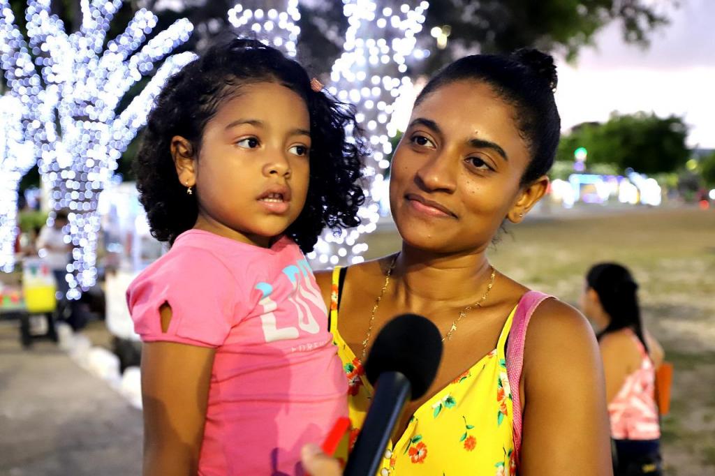 As principais novidades desta edição, a exemplo das árvores cerejeiras 3D com micro lâmpadas internas LED e o globo de neve plástico 3D com abertura para crianças interagirem com neve artificial não passaram despercebidas pela visitante Janaína Carvalho, que veio de Salvador junto com a filha Heloísa.