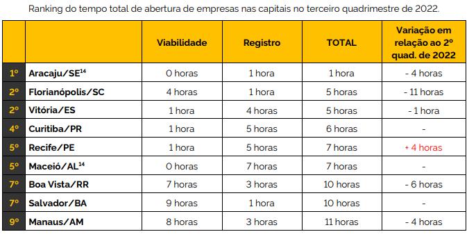 Aracaju inicia o ano liderando o ranking das capitais nacionais com menor tempo para abertura de empresa de baixo risco no Brasil, de acordo com o resultado do 3º Quadrimestre do Mapa de Empresas, ferramenta do Governo Federal que disponibiliza informações mensais a respeito do registro, número de empreendimentos abertos e fechados, entre outros detalhes da atividade econômica. O 1º lugar é resultado de um minucioso trabalho desenvolvido pela Prefeitura de Aracaju, através da Secretaria Municipal da Fazenda (Semfaz), que tem investido na modernização e desburocratização dos procedimentos e sistemas.