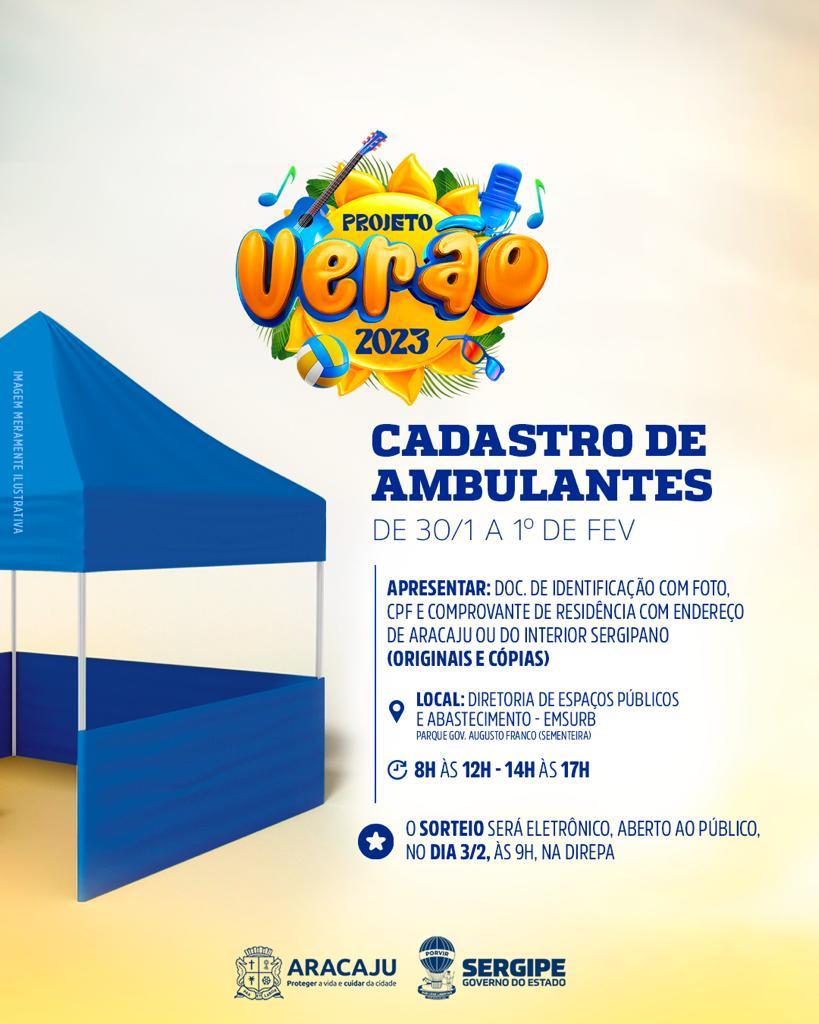 A Empresa Municipal de Serviços Urbanos (Emsurb) vai realizar, no período de 30 de janeiro a 1º de fevereiro, o processo de cadastramento dos interessados em concorrer a um espaço público para comercialização na área do Projeto Verão 2023, evento que será realizado pela Prefeitura de Aracaju e Governo do Estado, nos dias 10, 11 e 12 de fevereiro, na Orla da Atalaia.