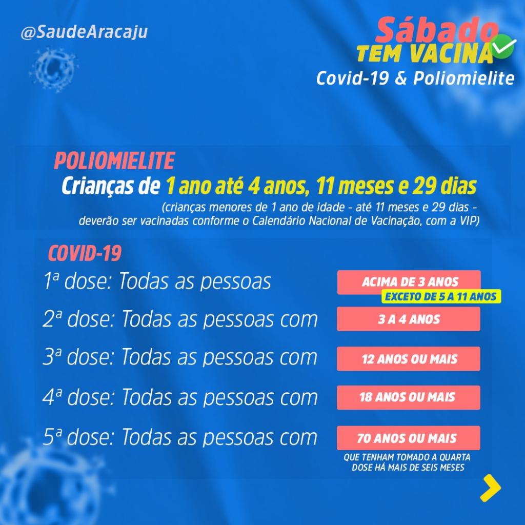 Neste sábado, 4, a Prefeitura de Aracaju, por meio da Secretaria Municipal da Saúde (SMS), continuará ofertando o serviço de vacinação contra a covid-19 e a poliomielite nos pontos montados dos shoppings RioMar, Jardins e Aracaju Parque, das 10h às 17h.