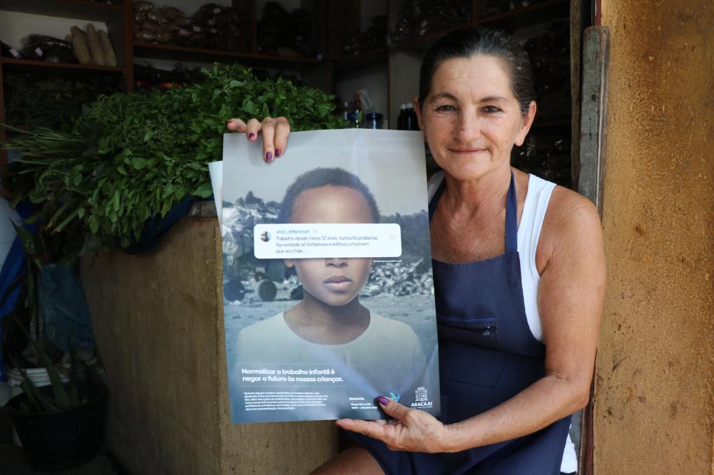 Andréa Santana vende artigos de artesanato no local há mais de 20 anos e aderiu à campanha colando um cartaz em seu estabelecimento. “Acho que a criança tem que estudar porque quando começa a trabalhar, abandona os estudos. Como vejo isso acontecer, eu aderi à campanha, decidi apoiar para chamar a atenção das pessoas. O trabalho que vocês estão fazendo está maravilhoso, tem que fazer mesmo para conscientizar a sociedade”, reforçou.