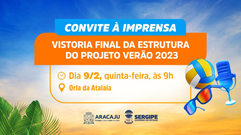 A Prefeitura de Aracaju e o Governo de Sergipe realizarão a vistoria gfinal da estrutura montada para a realização do Projeto Verão 2023, na Orla da Atalaia, nesta quinta-feira, dia 9, às 9h. O prefeito Edvaldo Nogueira e o governador Fábio Mitidieri acompanharão o trabalho de vistoria feito pela Defesa Civil de Aracaju e Corpo de Bombeiros Militar de Sergipe.