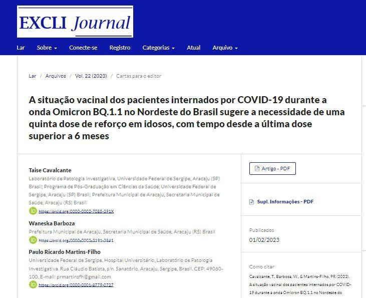 O título do artigo é "A situação vacinal dos pacientes internados com Covid-19 durante a onda Omicron BQ.1.1 no Nordeste do Brasil sugere a necessidade de uma quinta dose de reforço em idosos com tempo superior a 6 meses desde a última dose", e pode ser acessado no seguinte link: https://www.excli.de/index.php/excli/article/view/5807