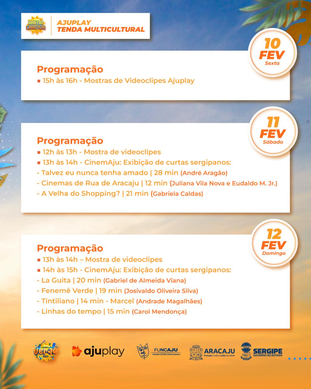 A edição especial do CinemAju, na Arena criativa, contará com a exibição de sete curtas-metragens: no dia 11 de fevereiro, das 13h às 14h; e no dia 12 de fevereiro, das 14h às 15h. Confira abaixo a lista dos filmes: