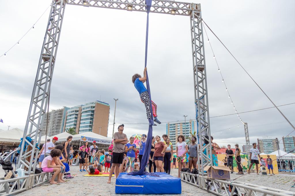 O passeio na Arena Criativa não para por aí. Na Área Externa, as oficinas circenses propõem uma mistura de arte e desafio corporal. Participando da oficina de Tecido Acrobático e Acrobacia de Solo, a acrobata Maria Paula Ramalho Barreto, que desde 2019 frequenta aulas de circo, caracteriza a programação como uma plataforma artística diversa.