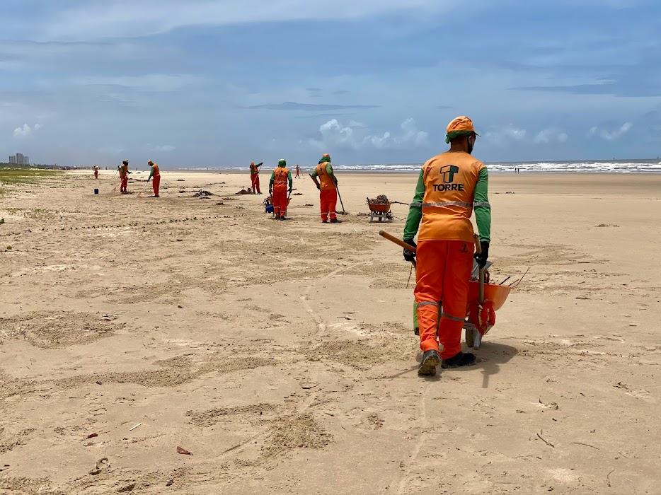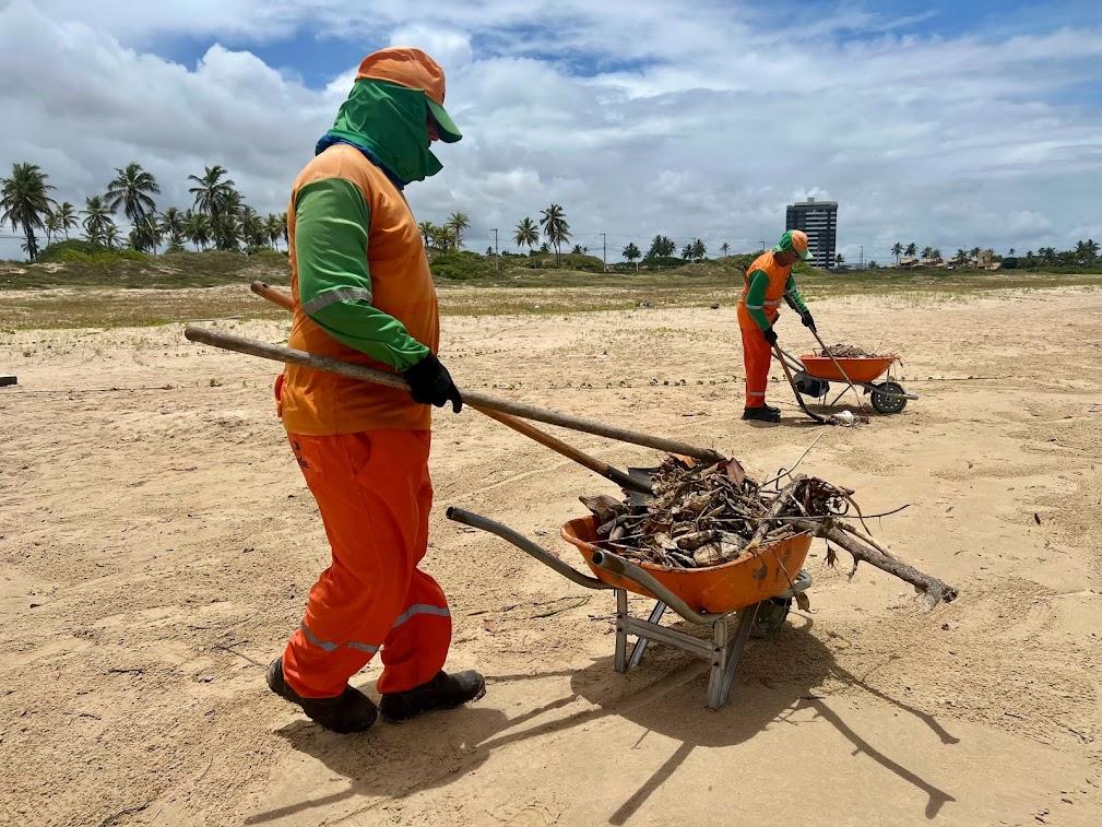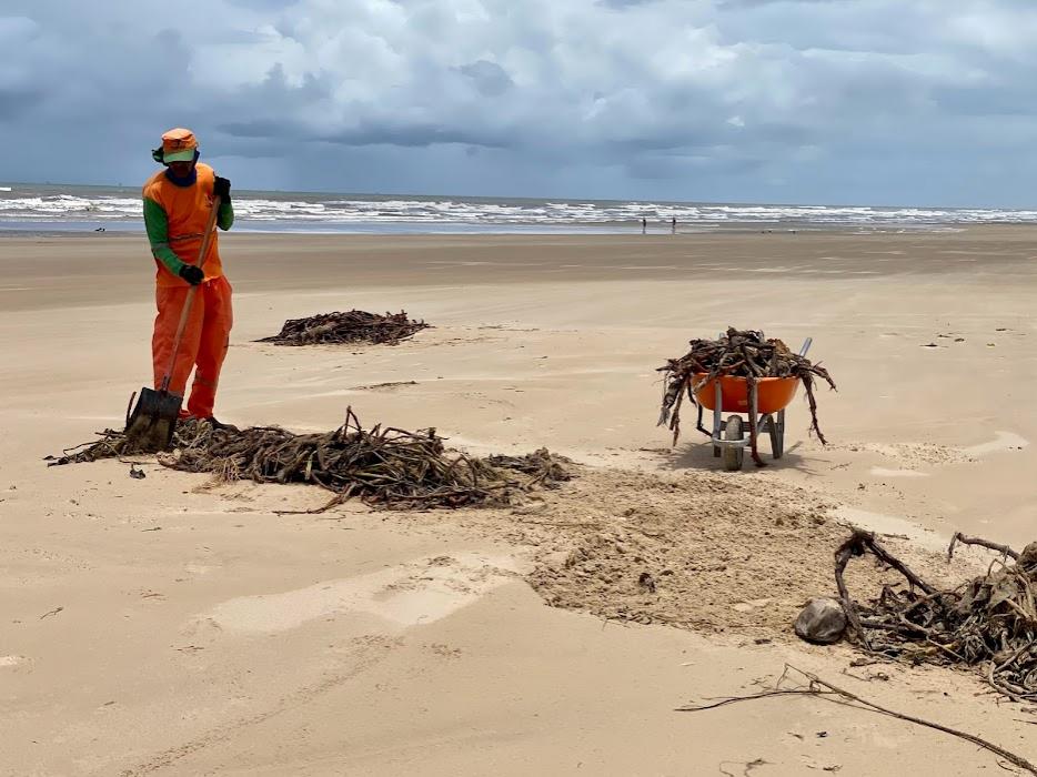 Para dar agilidade ao recolhimento do material orgânico, conhecido popularmente como sargaço e decorrente de um grande volume de chuvas registradas em zonas de rios, como também pela ação de correntes marítimas, a Emsurb mobilizou um aproximado de 50 agentes de limpeza em atividades que envolvem o gadanhamento e a devida coleta, esta última contando com o auxílio de caçambas e máquina retroescavadeira.