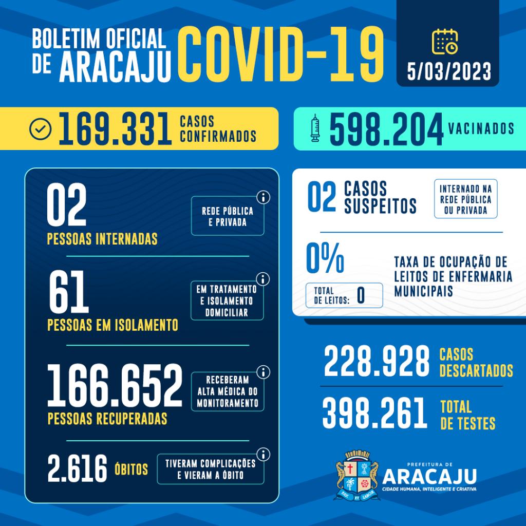 Com isso, 169.331 pessoas foram diagnosticadas com covid-19 em Aracaju. Dessas, duas estão internadas em hospital e 61 pacientes em isolamento domiciliar; 166.652 que estavam infectados já estão recuperadas e 2.616 foram a óbito.